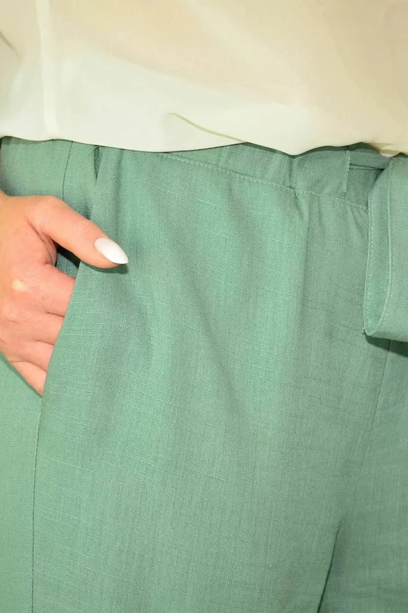 Брюки с высокой посадкой, с умеренно широкими брючинами, представляют собой универсальный фасон, который подойдет каждой женской фигуре, а если есть желание оптически удлинить ноги - надеваем обувь на платформе либо шпильки. Хлопковые брюки очень удобные и дышащие. Брюки с притачным поясом с резинкой, по переду пояса обработаны 2 петли, в которые втянута неширокая завязка. Передние половинки брюк с боковым карманом, с отрезным бочком.