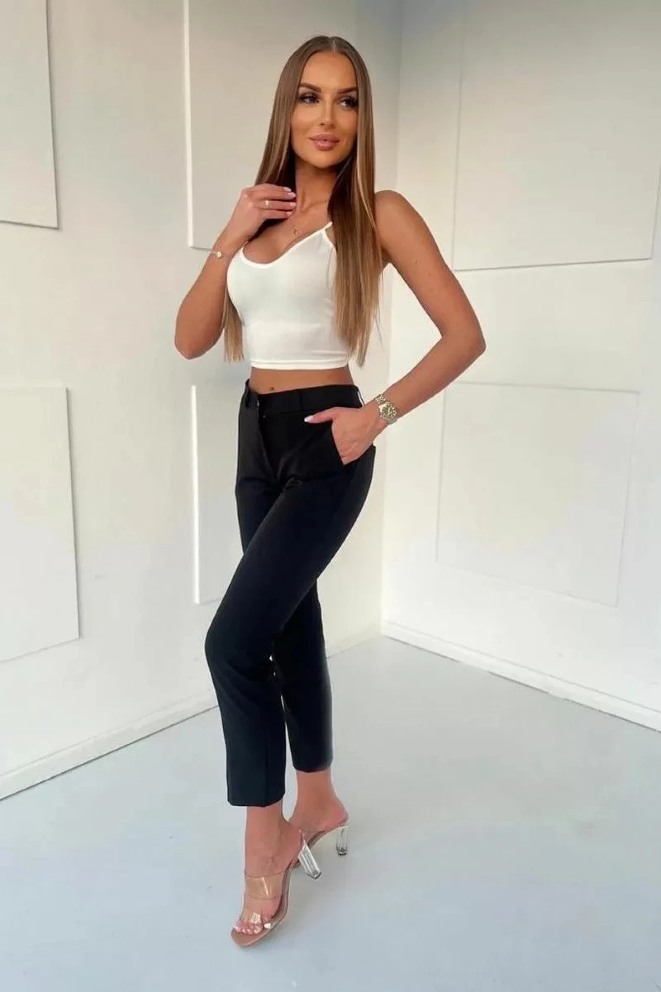 Костюм женский, состоящий из жакета и брюк. Жакет приталенного силуэта, на подкладке, с плечиками, застегивается на 1 пуговицу на талии, остальные пуговицы декоративные, с фальш карманами. Воротник пиджачного типа. Рукав втачной. Брюки прямого силуэта, укороченные 7/8. Передняя часть с карманами, застёжкой на молнию, петлю, пуговицу. Пояс без резинки.