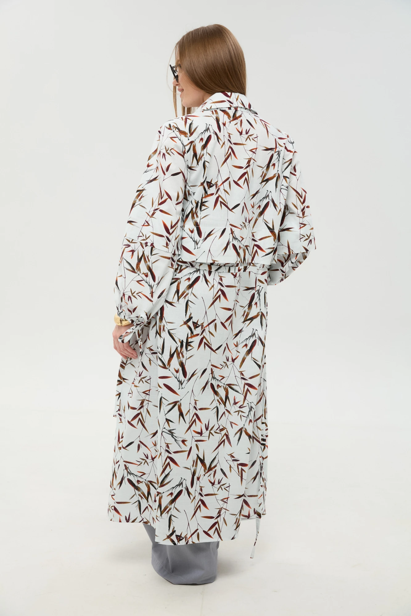 Костюм трехпредметный: состоит из кардигана-платья, брюк и топа. Платье-кардиган макси с центральной отрезной застёжкой на потайную планку на петли и пуговицы. По переду и спинке цельнокроеные складки на уровне талии. Рукав втачной, одношовный рубашечного типа. По низу рукава пробиты петли и вставлена завязка для фиксации сборки . Воротник рубашечный стояче отложной. В комплект к изделию идёт пояс из основной ткани для максимально комфортного регулирования объёма. Брюки свободного кроя, верхний срез представлен широкой резинкой, с карманами. По центру правой брючины расположена планка с функционирующими петлями и пуговицами. Топ на тонких регулируемых бретелях.