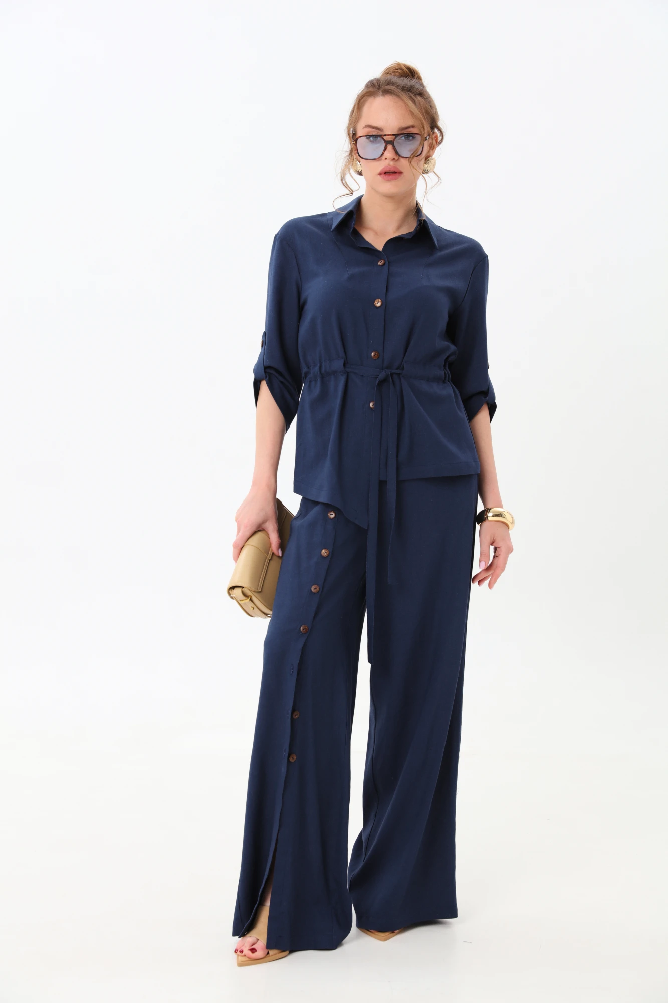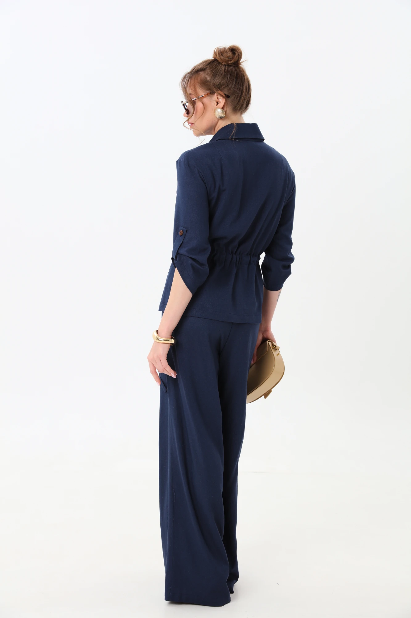Костюм двухпредметный: состоит из жакета и брюк. Жакет прямого силуэта, воротник пиджачного типа, рукав одношовный, втачной с незначительно спущенной линией плеча, длиной три четверти, с патой. По линии ткани настрачная кулиса с завязками из основной ткани. Застежка центрально-бортовая. Линия низа верхней части фигурная ассиметричная. Брюки свободного кроя, верхний срез представлен широкой резинкой, с карманами. По центру правой брючины расположена планка с функционирующими петлями и пуговицами.