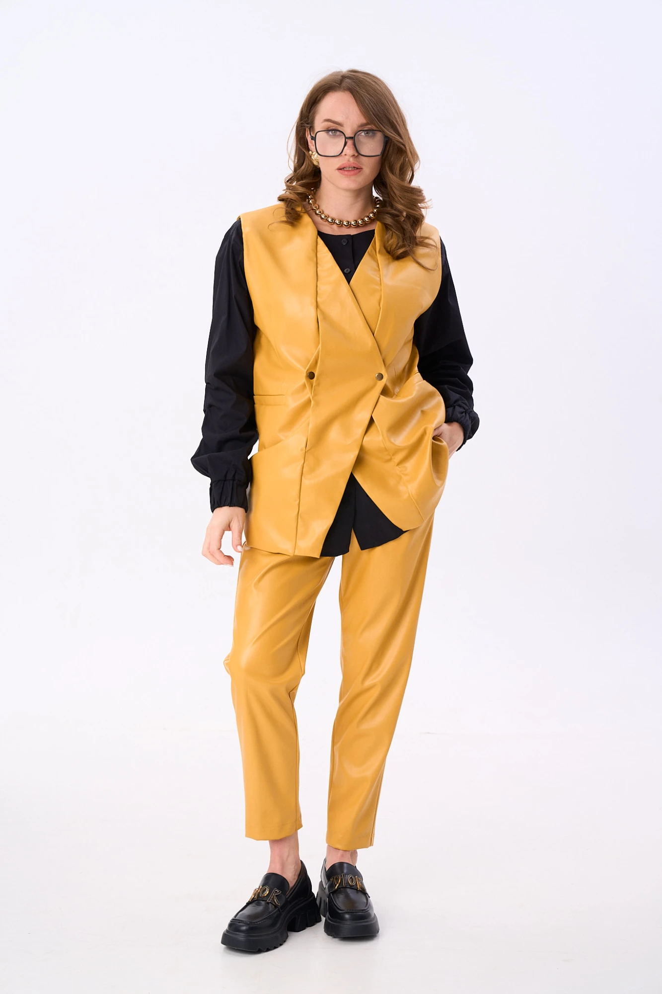 Костюм двухпредметный: состоит из жилета, брюк. Жилет двубортный прямого кроя объёма оверсайз. Застёжка фигурная на кнопки. Карманы - листочки. Брюки с притачным поясом и с карманами в боковых швах.