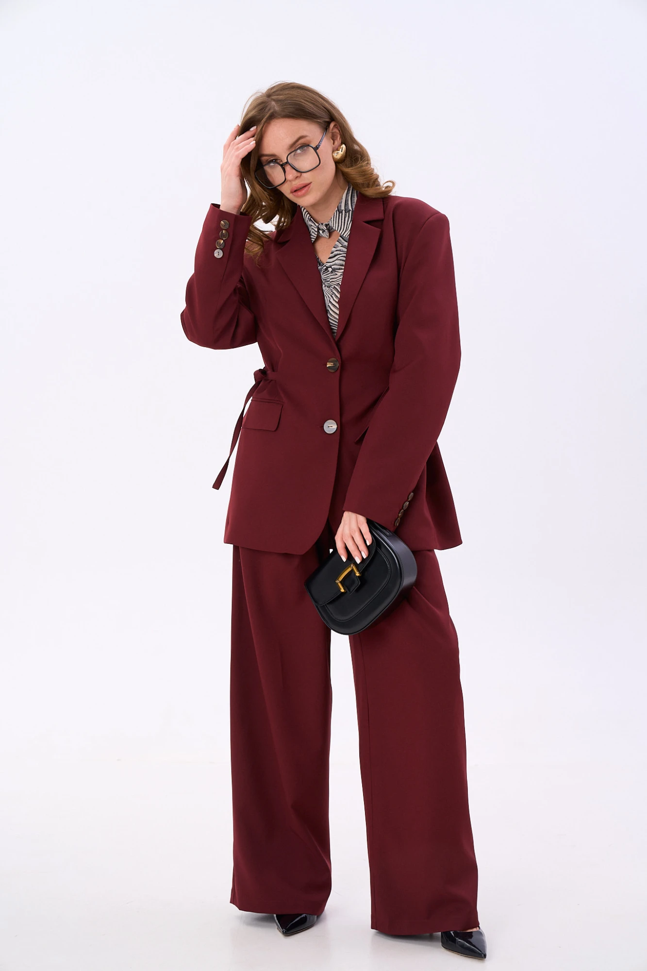 Жакет на притачной подкладке. Изделие с декоративным элементом в виде завязок по бокам. Элегантные брюки прямого кроя с боковыми карманами с отрезным бочком. Застежка на молнию и пуговицу. По переду - складки. Задние половинки с талиевыми вытачками и прорезными карманами с листочкой. Верхний срез обработан притачным поясом, по спинке собран на резинку. Низ обработан швом в подгибку.