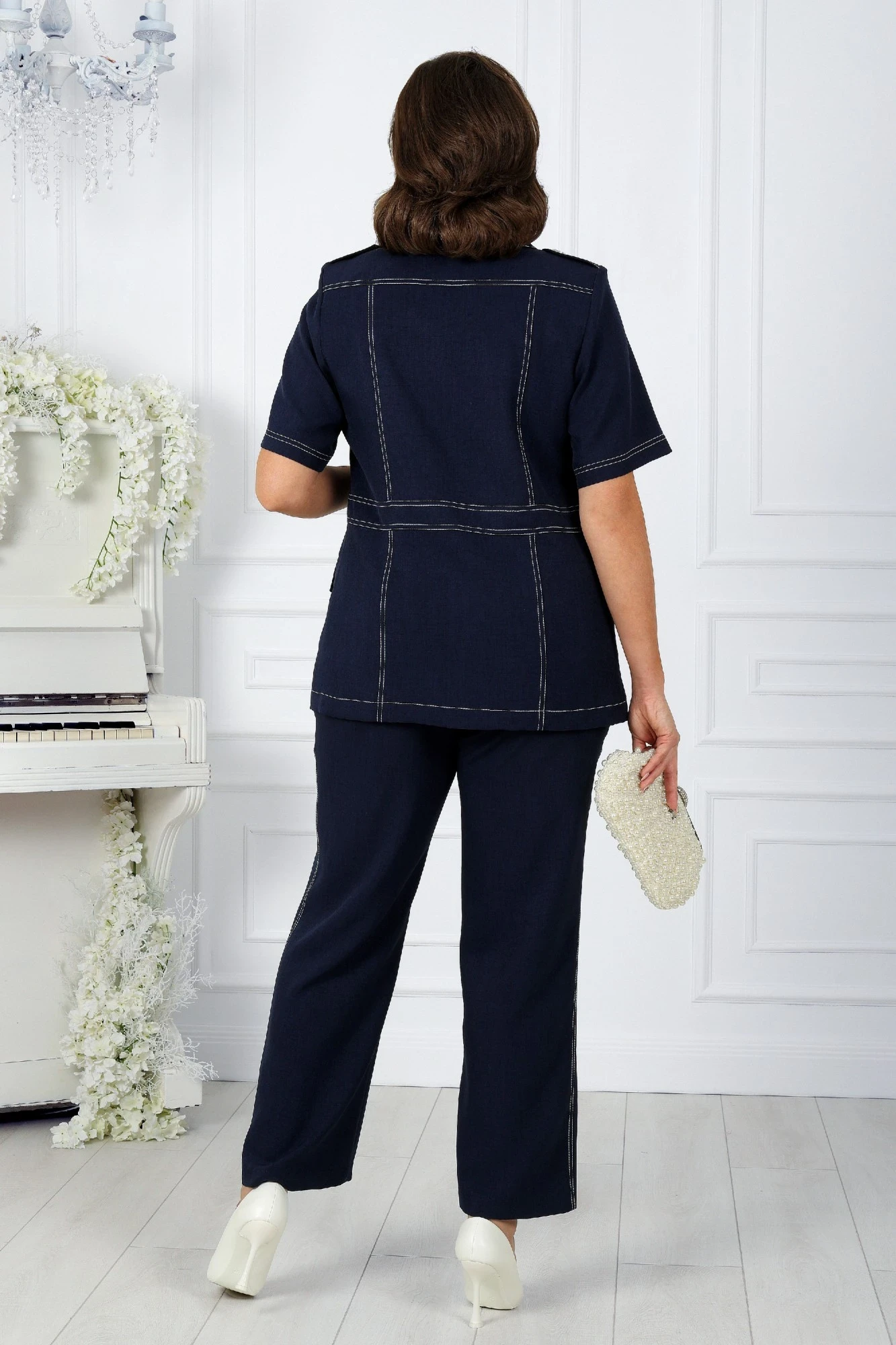 Комплект брючный 2-х предметный, состоящий из жакета и брюк, выполненных из ткани лен-вишер. Этот костюм не только стильный и модный, но и практичен. Он подходит как для деловых мероприятий, так и для повседневного использования, придавая вашему образу изысканность и утонченность. Особенностью этого костюма является контрастная двойная отделочная строчка на жакете. Эти элементы не только добавляет интереса к образу, но и создает визуальное подчеркивание, что помогает создать идеальный силуэт для женщин с большими размерами. Контрастные строчки выгодно подчеркивают форму жакета, делая его более стройным и элегантным. Жакет полуприлегающего силуэта, с центральной бортовой застежкой на 3 петли и 3 пуговицы до перегиба лацкана. Воротник пиджачного типа, на правом лацкане выметаны 4 глазковые неразрезные декоративные петли. Длина изделия по середине спинки 70 см, до шва втачивания воротника. Перед с наклонными кокетками, идущими от горловины в пройму, с рельефными швами, проходящими через центр груди и идущими от кокеток до низа. В нижней части переда расположены накладные карманы прямоугольной формы, и клапаны фигурной формы, с застежкой на 1 петлю и на 1 пуговицу. Спинка с горизонтальной кокеткой и рельефными швами, идущими от кокетки до низа. От рельефных швов переда через всю спинку настрочен декоративный пояс. На плечевых швах расположены паты, фиксирующиеся на жакете на 1 пуговицу. Рукава втачные, одношовные. Длина рукавов 28 см. По шву притачивания кокеток переда и спинки, по рельефным швам, краю борта, воротнику, патам, клапанам, карманам, поясу, низу рукавов прострочена контрастная отделочная строчка на двух-игольной машине. По низу изделия прострочена 1 контрастная отделочная строчка на расстоянии 3 см от низа. Жакет с плечевыми накладками. Брюки классические, с посадкой на талии, на притачном поясе, с застёжкой на тесьму-«молния», расположенную в среднем шве передних половинок, и 1 петлю и 1 пуговицу на поясе. Задние половинки брюк с талиевыми вытачками, идущими от пояса вниз. Передние и задние половинки брюк с заутюженными стрелками. Для лучшего прилегания брюк в области талии в поясе со стороны спинки вставлена резинка. По боковым швам брюк прострочена контрастная отделочная строчка на двух-игольной машине.