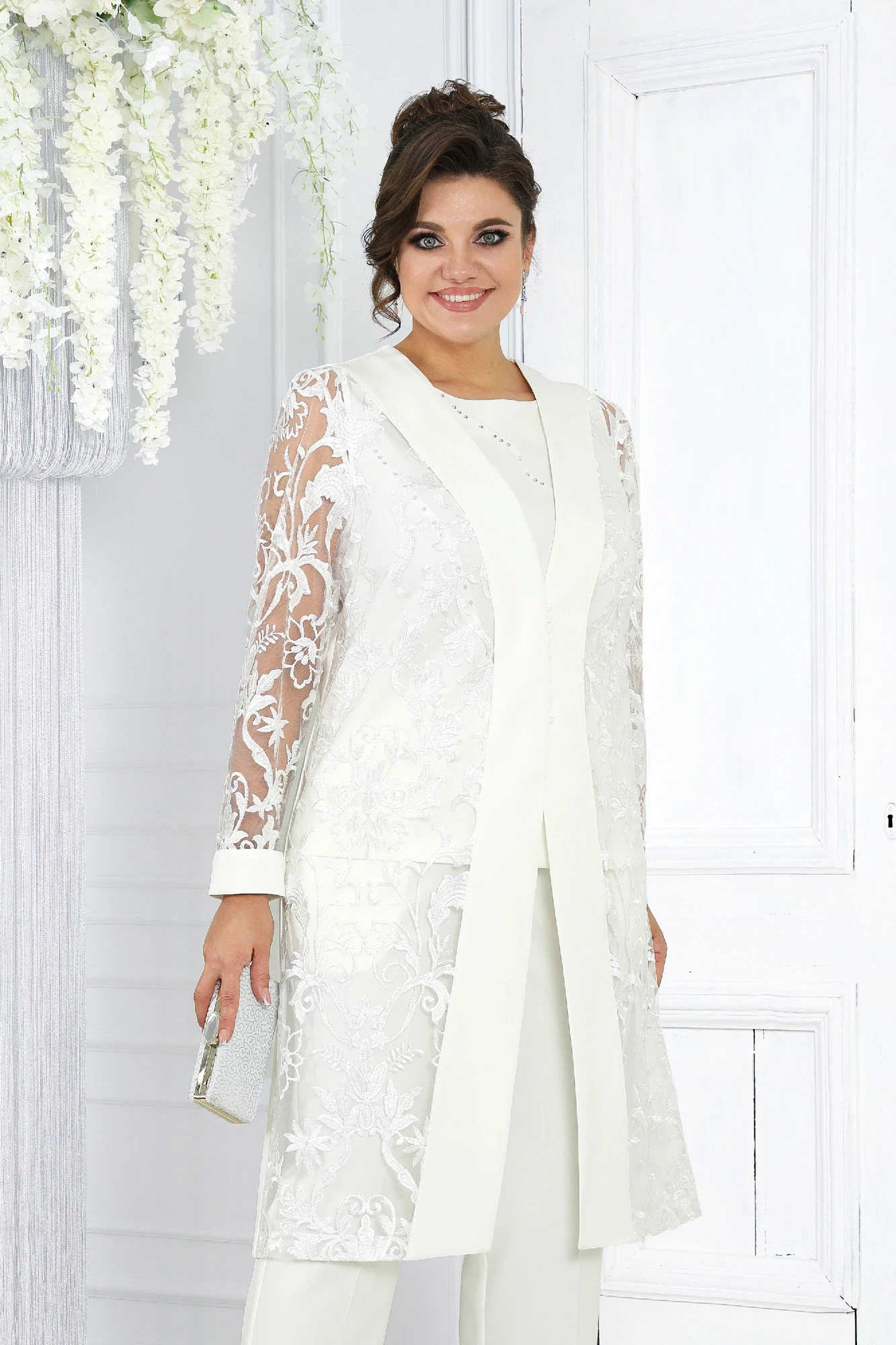 Комплект брючный 3-х предметный, состоящий из кардигана, блузки и брюк; выполнен из костюмно-плательной ткани и гипюра.