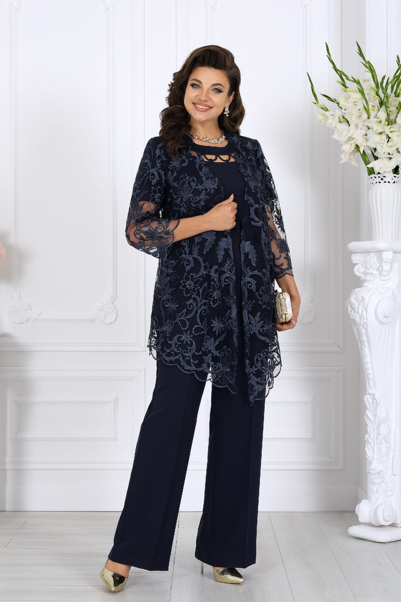 Комплект состоит из трёх предметов: изысканного кардигана из гипюра, мягкой трикотажной блузки и классических брюк со стрелками. Такой ансамбль выглядит нарядно, подчеркивает женственность и формирует правильный силуэт даже для фигур plus size.