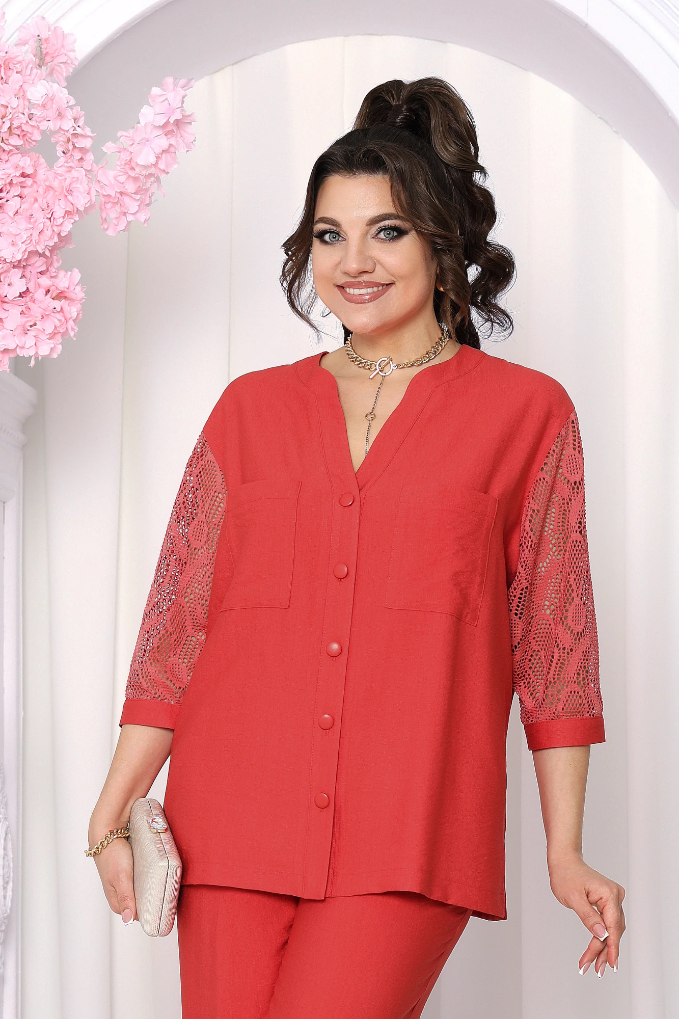 Основным акцентом этого костюма является блузка, дополненная ажурными кружевными рукавами и вставкой, что придает образу нарядность и легкость, а фигурные планки с пуговицами добавляют деловой акцент — идеальное сочетание для офисного гардероба и праздничных мероприятий.