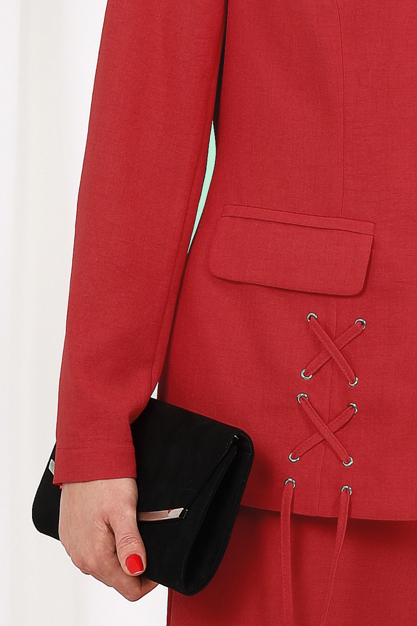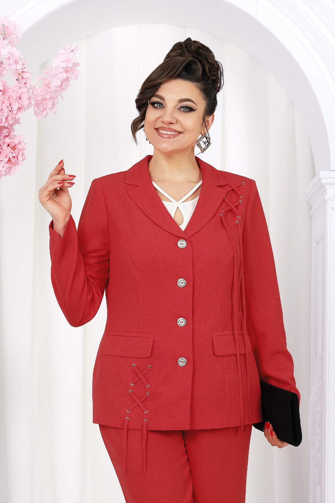 Жакет однобортный, полуприлегающего силуэта, выполнен из ткани «лен-вишер». Модель частично на хлопковой подкладке (перед и спинка), с плечевыми накладками. Спереди обработаны рельефные швы, направленные от пройм до низа; в нижней части переда расположены прорезные карманы с клапаном. Перед с центральной внешней застежкой на 4 декоративные пуговицы. Спинка со средним швом и рельефными швами, направленными от пройм до низа. Воротник пиджачного типа. Рукав длинный, втачной. Декоративным элементом жакета являются завязки из основной ткани, протянутые в металлические блочки, расположенные параллельными рядами в области левого плеча и под правым карманом. Длина жакета – 65 см; длина рукава – 61 см.