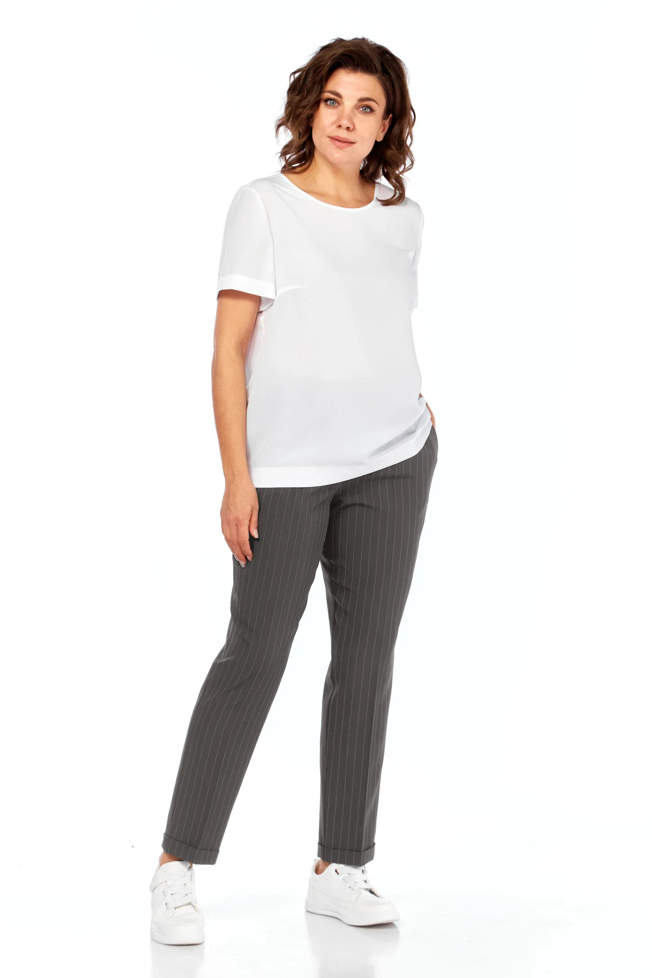 Стильный комплект состоящий из жакета, брюк и блузы. Жакет прямого силуэта с пиджачным воротником, подкладка на полочке, без застежки. По бокам накладные карманы с клапанами. На правом клапане декоративная нашивка. По талии кулиска. Рукава втачные, длиной три четверти с патами. Брюки прямые, зауженные к низу, с отворотом, пояс притачной на эластичной тесьме с кулиской, боковые карманы . Блуза прямого силуэта, рукав короткий. В комплекте два шнурка белый и в тон костюма.