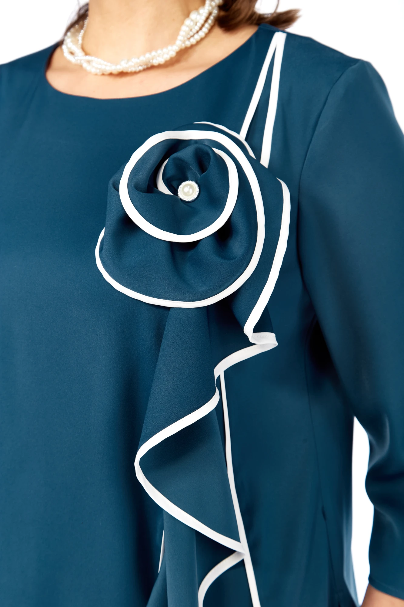 Стильный нарядный костюм из мягкой струящейся ткани. Блуза прямого силуэта с декоративным цветком, пришивным. Спинка со средним швом, в котором потайная молния. Рукав прямой. Разрезы в боковых швах. Брюки прямые с карманами в боковых швах. Пояс на резинке по спинке, по переду молния и петля и пуговица.