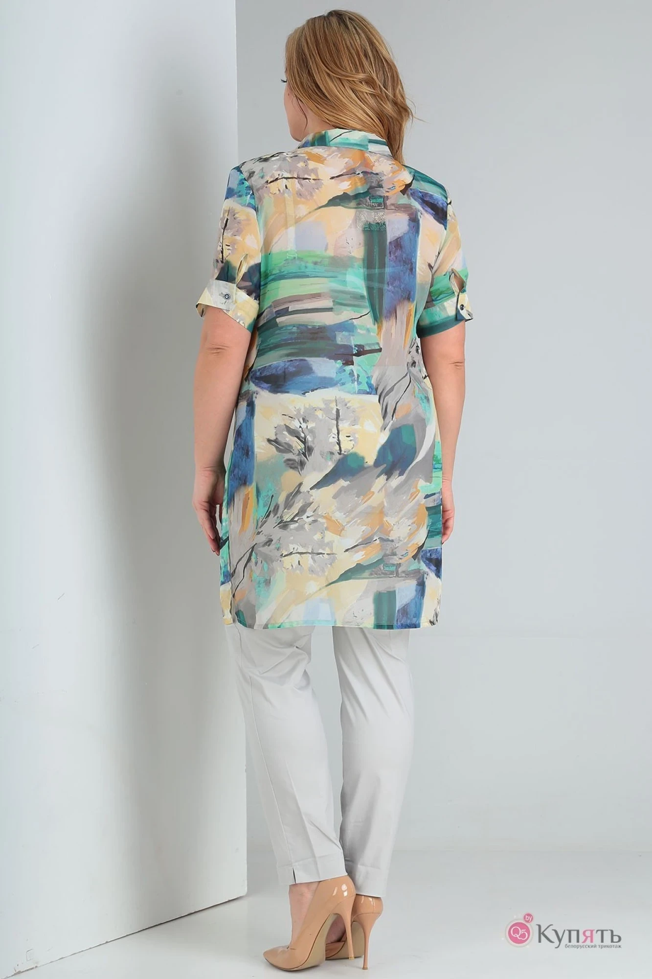 Костюм женский. Блуза прямого силуэта, удлиненная из принтованного шифона. Застежка по центру на петли и пуговицы. Планка цельнокроеная, переходит в фигурный вырез к горловине. Воротник стояче-отложной, рубашечного типа. Рукав втачной, до локтя. Манжеты на пуговицах. По низу блуза с разрезами в боковых швах.