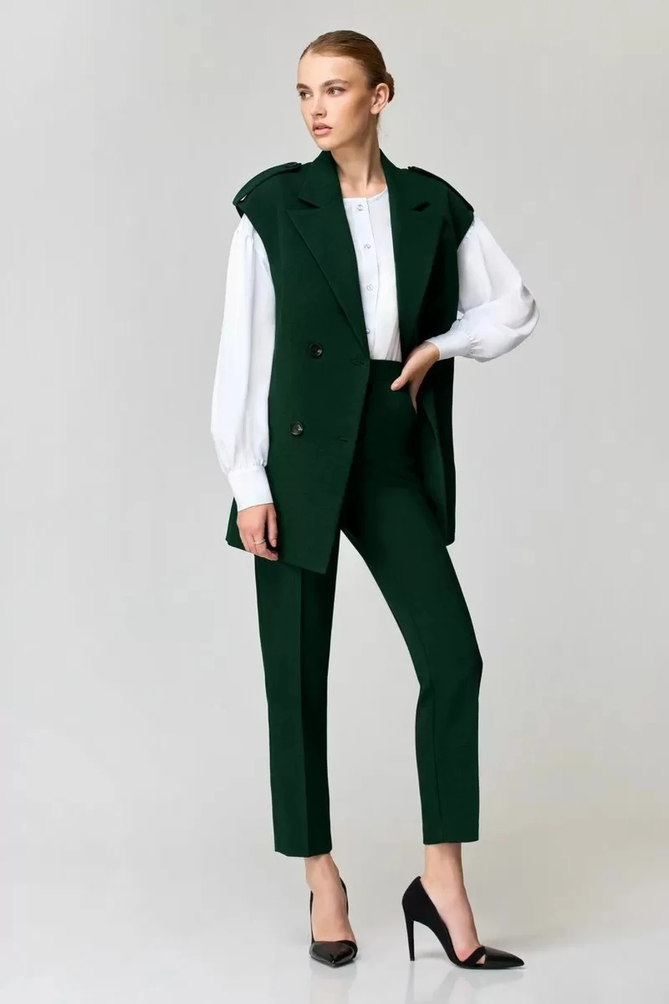 Жилет двубортный со спущенным плечом, на переду расположены вертикальные карманы в шве притачивания бочка, выточки нагрудные направлены от шва притачивания бочка. На спинке расположена горизонтально-направленная кокетка и средний шов. Горловина оформлена воротником пиджачного типа. В области плеча расположены паты «идущие» от проймы и фиксирующиеся на пуговицу.