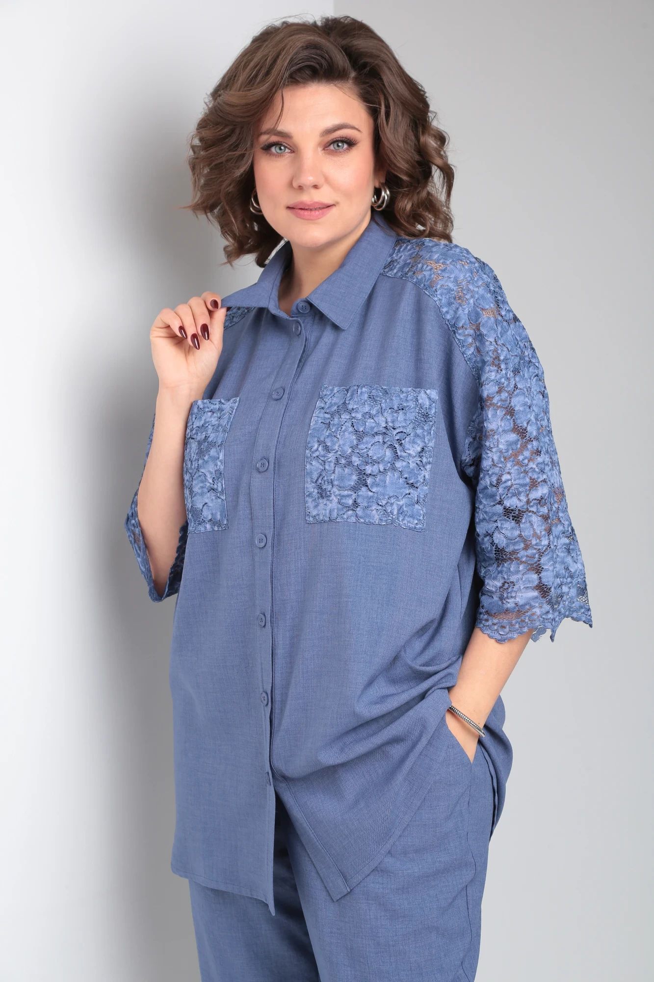 Стильный брючный льняной костюм состоит из блузки и брюк. Блузка женская типа "рубашка", свободного силуэта, длиной ниже линии бедра, со вставкой из кружевного полотна, по переду центральная застежка на петли-пуговицы. По спинке отрезная кокетка, от кокетки по центру заложена складка. Горловина оформлена рубашечным воротником со стойкой. Рукав кружевной, втачной, длина 3/4. Брюки женские классические, свободного силуэта, прямого кроя с высокой посадкой, с наклонными карманами в боковых швах, верхний срез оформлен поясом с эластичной резинкой. Внимание! Цветопередача фотографий может отличаться от реальности.