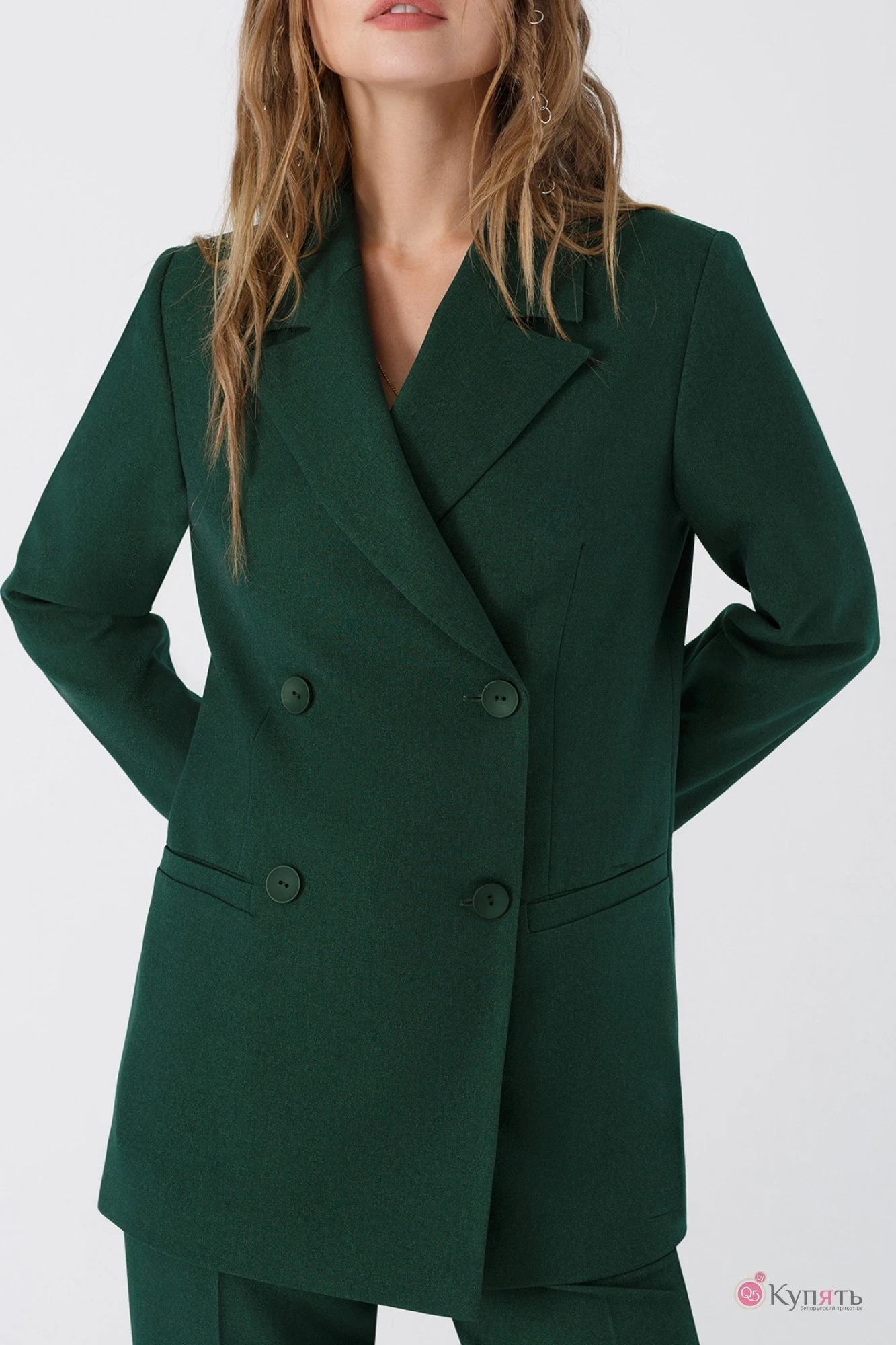 Костюм-тройка из двубортного жакета, трикотажного топа и прямых брюк со стрелками. Детали: прямой силуэт, пиджачный воротник, прорезные карманы, спинка со средним швом, втачные двухшовные рукава. Топ облегающего силуэта с фигурными проймами, спинка с глубоким вырезом. Брюки с высокой посадкой на притачном поясе со шлевками, застежка на молнию и пуговицу, боковые карманы, передние половины с заутюженными стрелками и двумя небольшими складками
