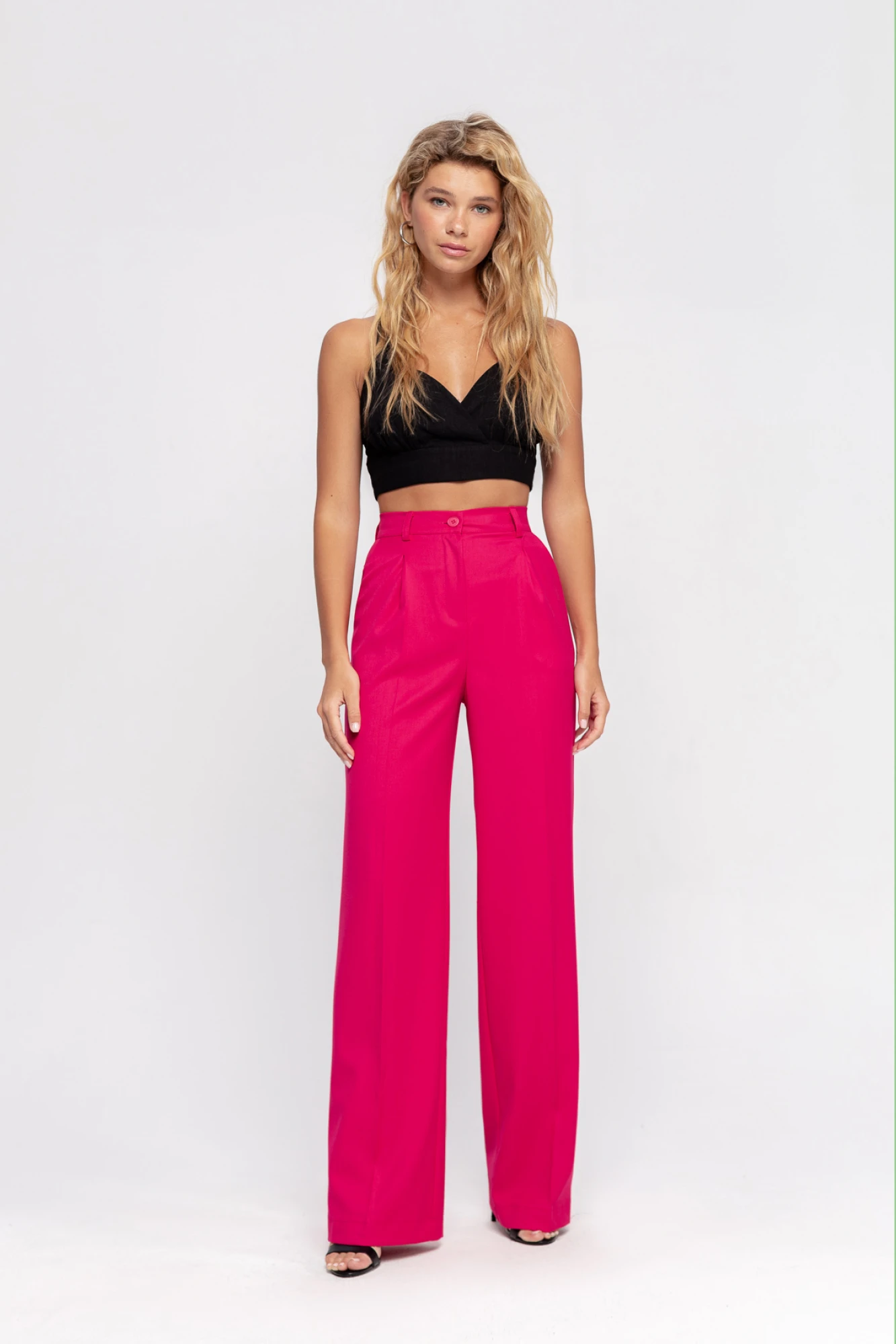 Текстильный костюм-двойка из полуприлегающего жилета и прямых брюк-палаццо Детали: жилет с талиевыми вытачками, застежка на петли и пуговицы, функциональные карманы, жилет на подкладке из 100% вискозы. Брюки с высокой посадкой на притачном поясе со шлевками, застежка на молнию и пуговицу, боковые карманы, передние половины с заутюженными стрелками и двумя небольшими складками Длина жилета по спинке около 48 см в размерах 40-46 и около 51,5 см в размерах 48-52; Длина брюк по боковому шву с поясом около 113 см в размерах 40-46 и около 114,5 см в размерах 48-52, длина по внутреннему шву около 82 см
