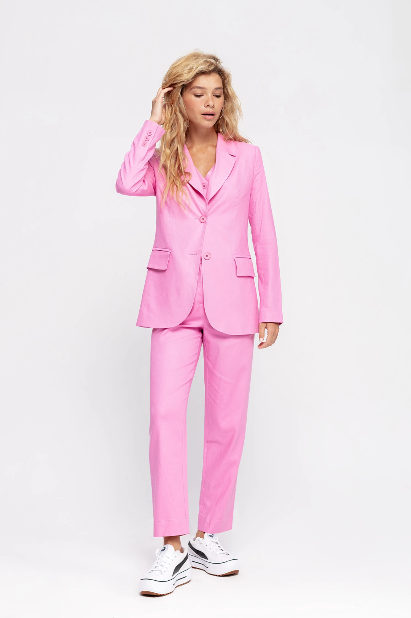 Костюм-двойка из свободного жакета со шлицами и брюк со складками из смесового льна Детали: жакет полуприлегающего силуэта, талиевые вытачки, пиджачный воротник, застежка на две петли и пуговицы, функциональные карманы, рукава и спинка со шлицами, жакет на подкладке из 100% вискозы. Брюки с высокой посадкой, притачной пояс со шлевками, задняя часть пояса эластичная- с резинкой, застежка на молнию и пуговицу, боковые карманы, передние половины с двумя складками Длина жакета по спинке около 70 см в размерах 40-46 и около 73 см в размерах 48-52 Длина рукавов около 63 см; Длина брюк по боковому шву с поясом около 99 см в размерах 40-46 и около 100,5 см в размерах 48-52, длина по внутреннему шву около 69,5 см