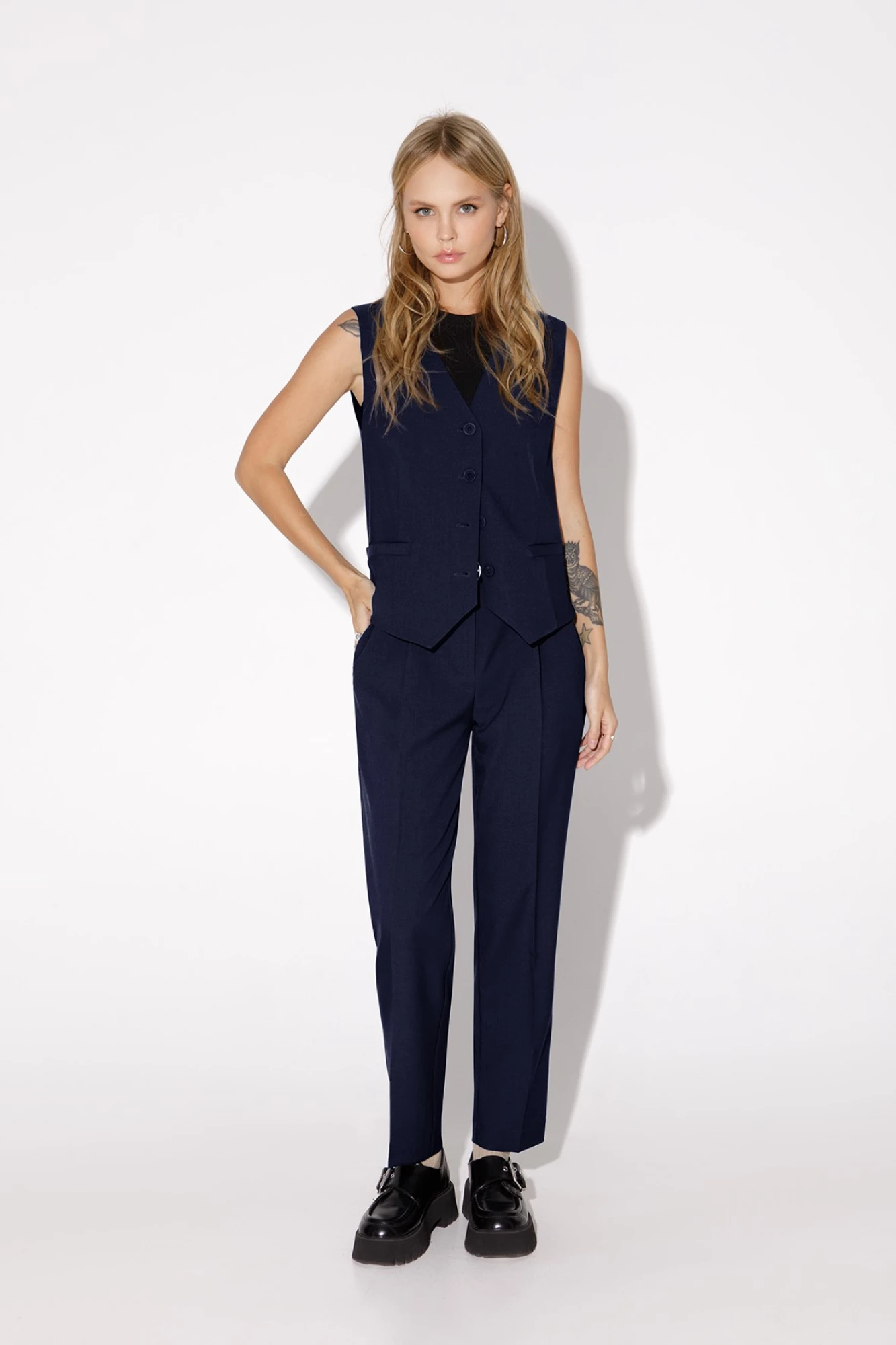 Классический костюм-тройка из двубортного жакета, полуприлегающего жилета и укороченных брюк со стрелками. Детали: жакет полуприлегающего силуэта, пиджачный воротник, перед с прорезными карманами, двубортная застежка на петли и пуговицы, спинка со средним швом, рукава втачные двухшовные, жакет на подкладке. Жилет полуприлегающего силуэта, фигурный низ, талиевые вытачки, застежка на петли и пуговицы, функциональные карманы, на подкладке. Брюки со средней посадкой, притачной пояс со шлевками, передние половины с небольшими мягкими складками и заутюженными стрелками, застежка на молнию и пуговицу, боковые карманы. Длина жакета по спинке около 66 см в размерах 40-46 и около 69 см в размерах 48-52, длина рукавов около 61 см. Длина жилета по спинке около 48,5 см в размерах 40-46 и около 51,5 см в размерах 48-52. Длина брюк по боковому шву с поясом около 97 в размерах 40-46 и около 98,5 см в размерах 48-52, длина по внутреннему шву около 70 см