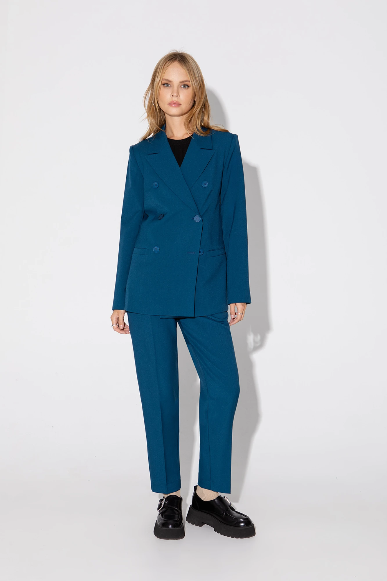 Классический костюм-тройка из двубортного жакета, полуприлегающего жилета и укороченных брюк со стрелками. Детали: жакет полуприлегающего силуэта, пиджачный воротник, перед с прорезными карманами, двубортная застежка на петли и пуговицы, спинка со средним швом, рукава втачные двухшовные, жакет на подкладке. Жилет полуприлегающего силуэта, фигурный низ, талиевые вытачки, застежка на петли и пуговицы, функциональные карманы, на подкладке. Брюки со средней посадкой, притачной пояс со шлевками, передние половины с небольшими мягкими складками и заутюженными стрелками, застежка на молнию и пуговицу, боковые карманы. Длина жакета по спинке около 66 см в размерах 40-46 и около 69 см в размерах 48-52, длина рукавов около 61 см. Длина жилета по спинке около 48,5 см в размерах 40-46 и около 51,5 см в размерах 48-52. Длина брюк по боковому шву с поясом около 97 в размерах 40-46 и около 98,5 см в размерах 48-52, длина по внутреннему шву около 70 см