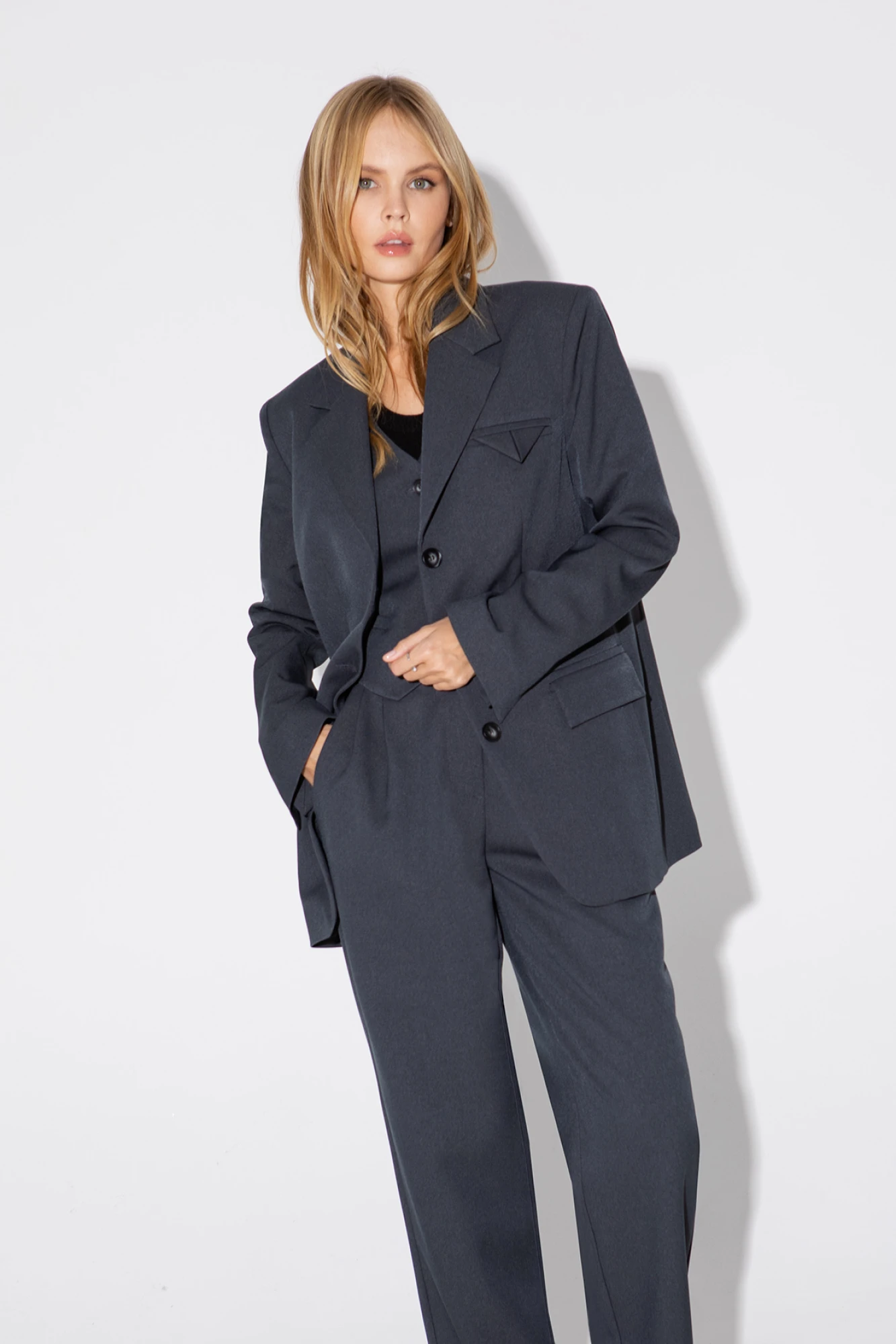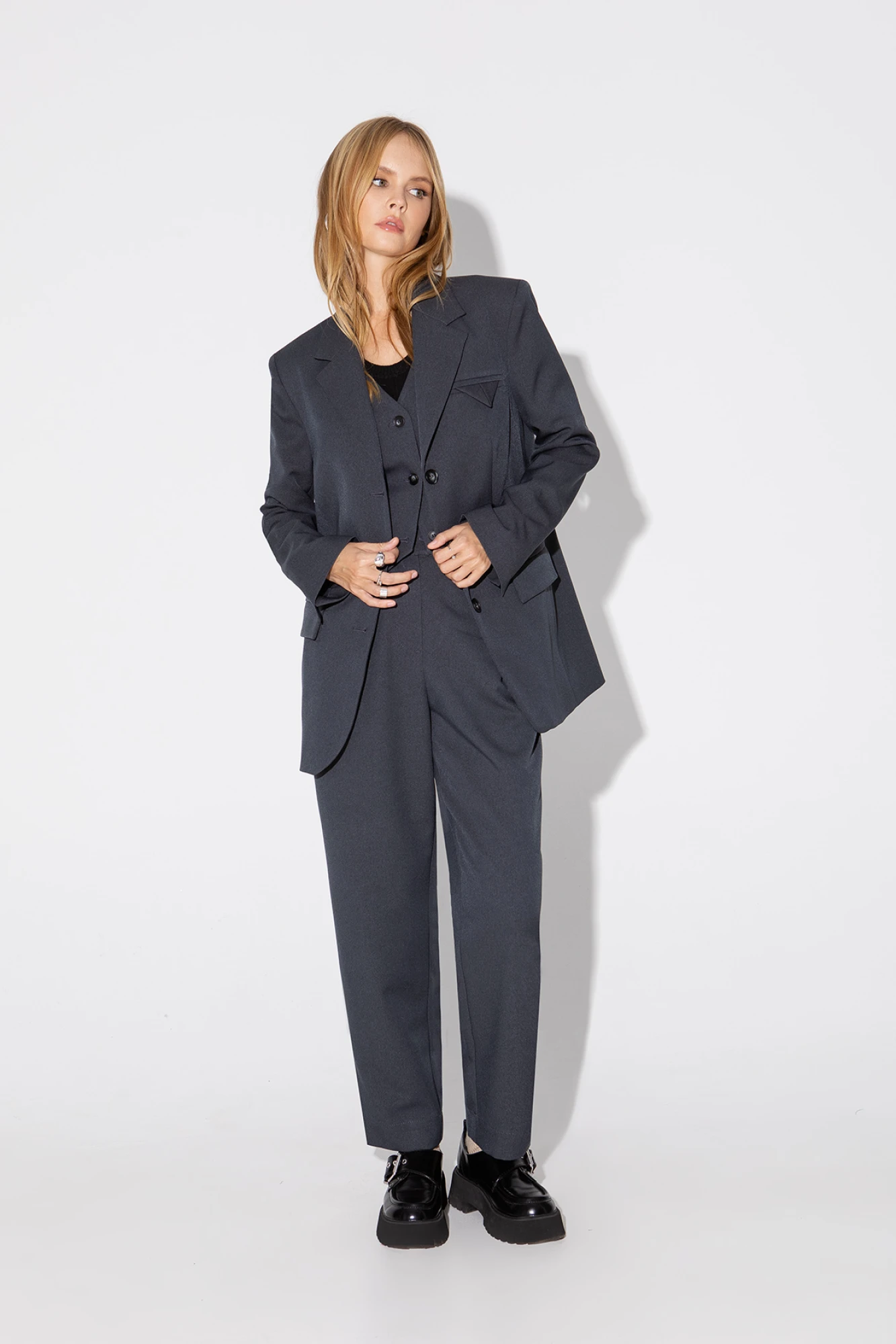 Текстильный костюм-тройка из свободного жакета, укороченного жилета и укороченных брюк с резинкой по поясу. Детали: жакет прямого силуэта, пиджачный воротник, перед с прорезными функциональными карманами, нагрудный декоративный карман, однобортная застежка на петли и пуговицы, спинка со средним швом, рукава втачные двухшовные с разрезами по низу, жакет на подкладке. Жилет прямого силуэта с фигурным низом, талиевые вытачки, застежка на петли и пуговицы, функциональные карманы, на подкладке. Брюки с высокой посадкой, притачной пояс со шлевками, задняя часть пояса эластичная- с резинкой, застежка на молнию и пуговицу, боковые карманы, передние половины с двумя складками Длина жакета по спинке около 72 см в размерах 40-46 и около 74 см в размерах 48-52, длина рукавов около 62,5 см. Длина жилета по спинке около 39 см в размерах 40-46 и около 43 см в размерах 48-52. Длина брюк по боковому шву с поясом около 99 см в размерах 40-46 и около 100,5 см в размерах 48-52, длина по внутреннему шву около 69,5 см