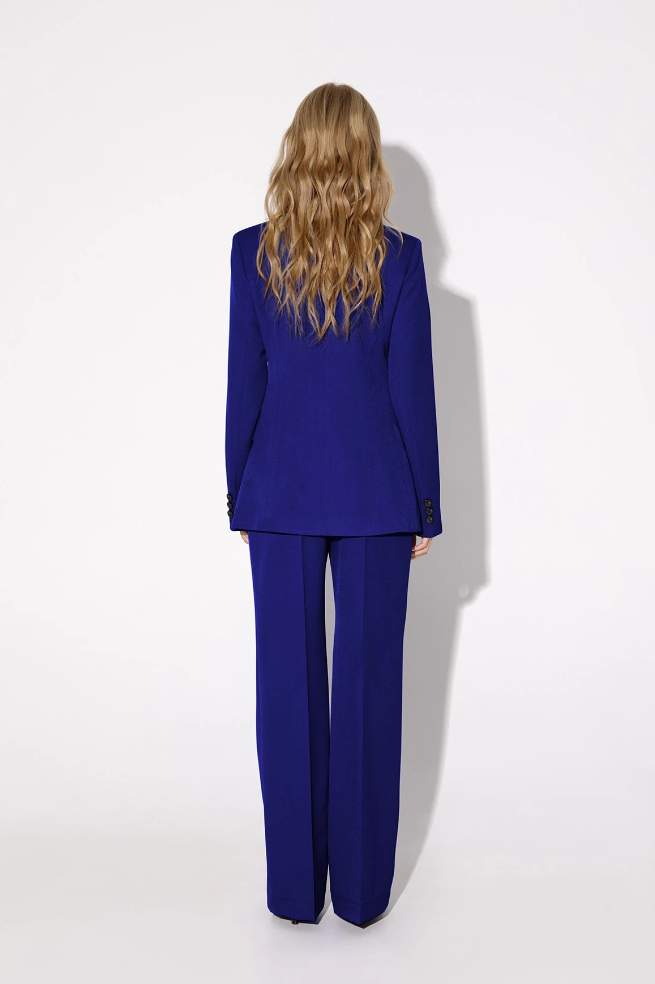 Текстильный комплект-тройка из классического полуприлегающего жакета, базовой трикотажной майки и широких прямых брюк Детали: жакет полуприлегающего силуэта, талиевые вытачки, пиджачный воротник, застежка на две петли и пуговицы, функциональные карманы, жакет на подкладке. Майка из трикотажа- «лапша», глубокие вырезы горловины и пройм. Брюки с высокой посадкой на притачном поясе со шлевками, застежка на молнию и пуговицу, боковые карманы, передние половины с заутюженными стрелками и двумя небольшими складками Длина по спинке около 68 в размерах 40-46 и около 71 см в размерах 48-52, длина рукавов около 61 см. Длина майки от плечевого шва около 37 см в размерах 40-46 и около 39 см в размерах 48-52. Длина брюк по боковому шву с поясом около 113 см в размерах 40-46 и около 114,5 см в размерах 48-52, длина по внутреннему шву около 82 см.
