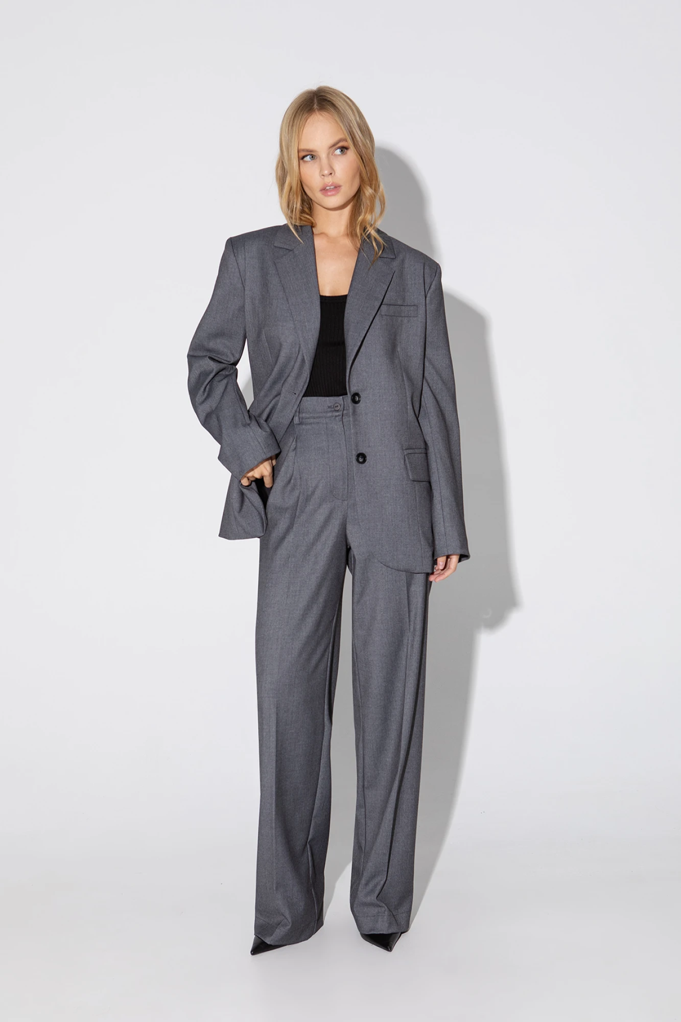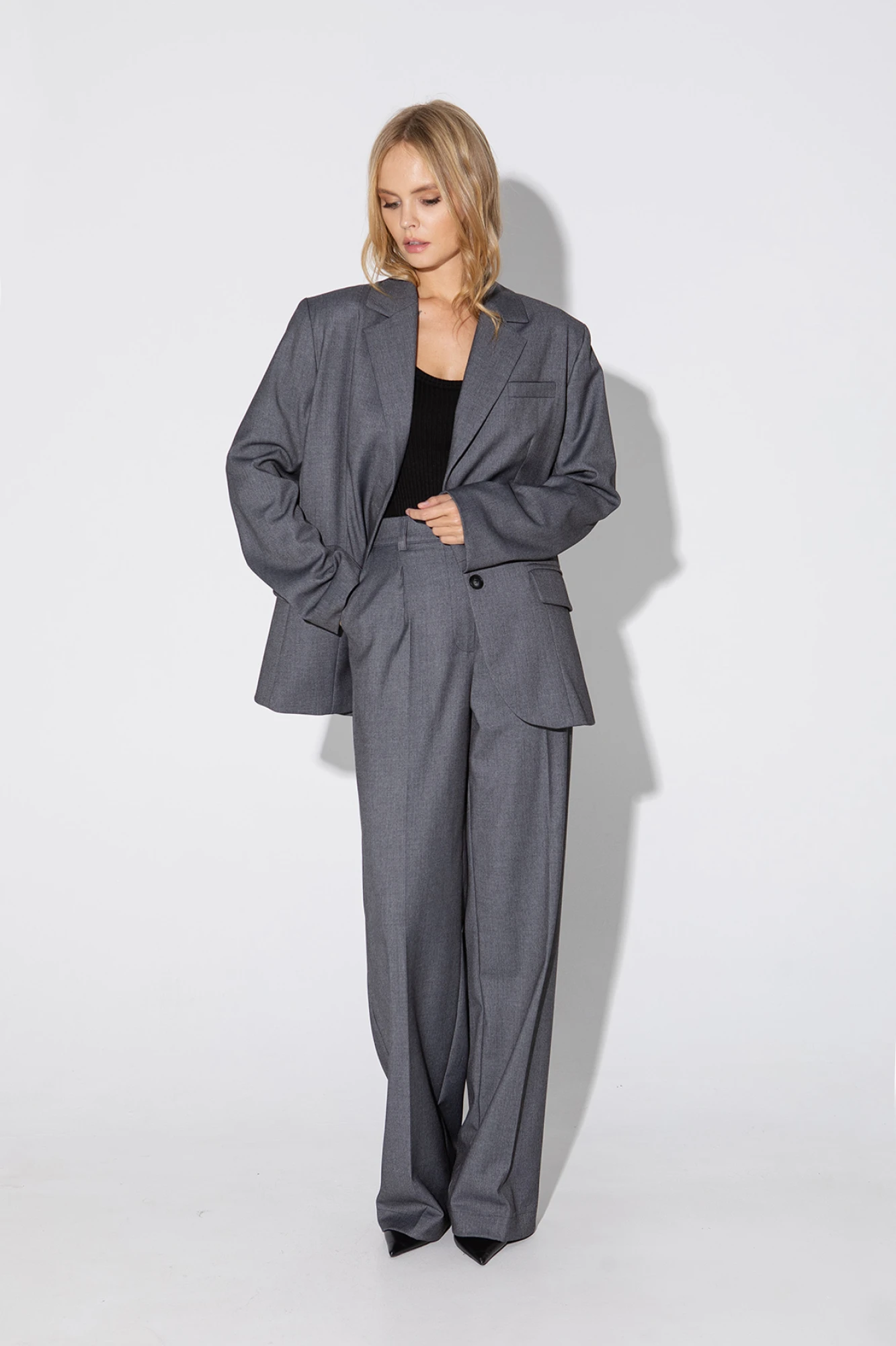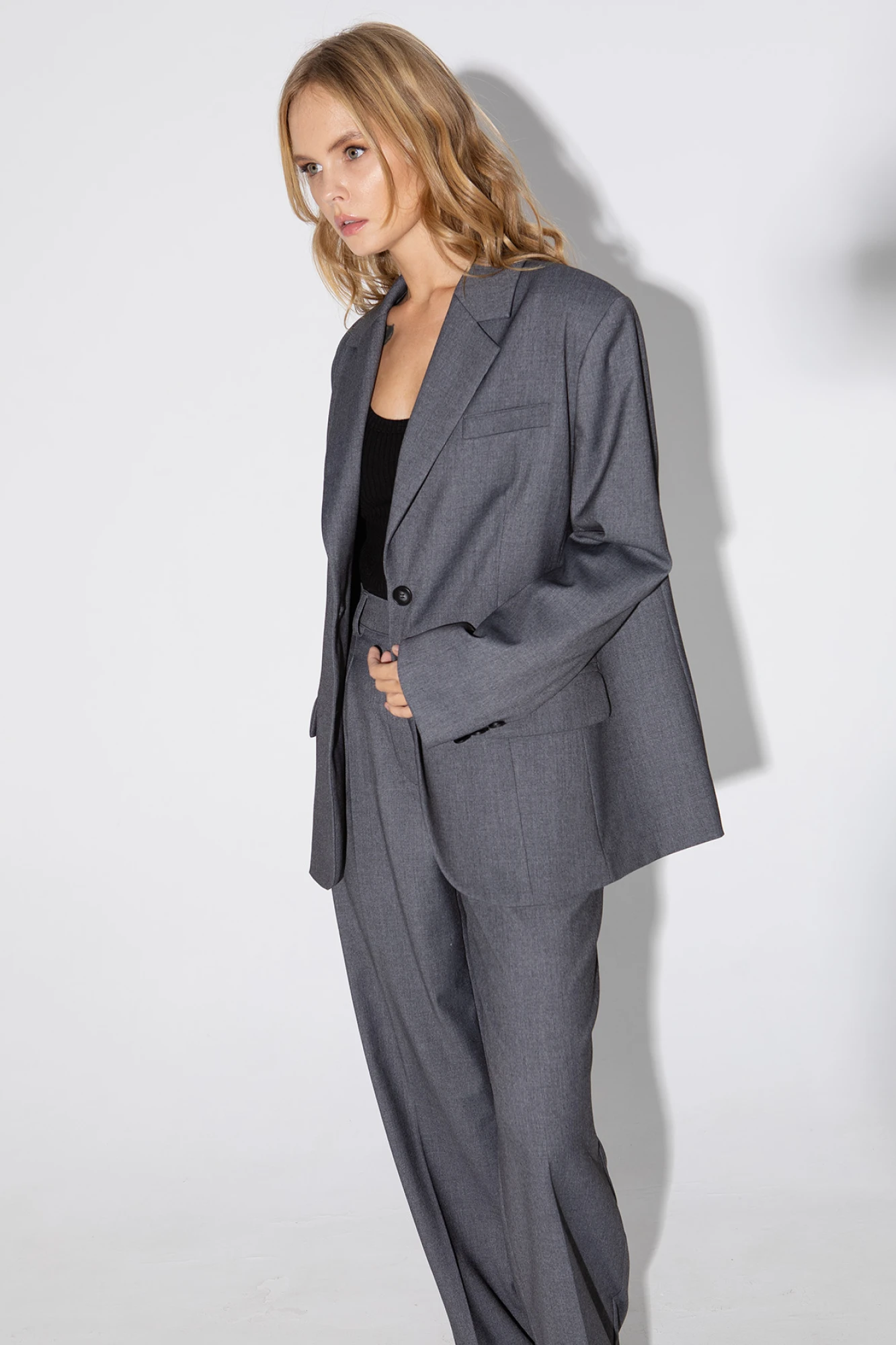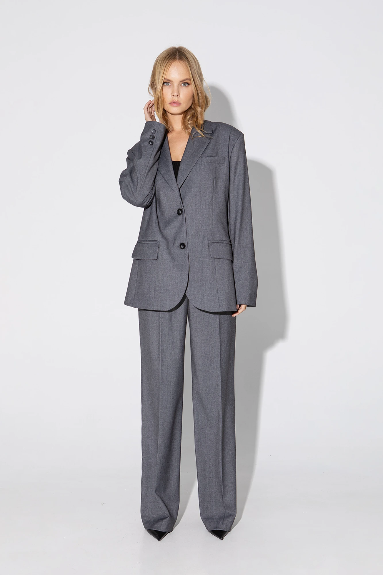 Текстильный костюм-двойка из оверсайз жакета и прямых брюк-палаццо со стрелками. Детали: жакет прямого силуэта, расширенная линия плеч, пиджачный воротник, перед с прорезными функциональными карманами, однобортная застежка на петли и пуговицы, спинка со средним швом и шлицей, рукава втачные двухшовные, жакет на подкладке. Брюки с высокой посадкой на притачном поясе со шлевками, застежка на молнию и пуговицу, боковые карманы, передние половины с заутюженными стрелками и двумя небольшими складками. Длина жакета по спинке около 69 см в размерах 40-46 и около 72 см в размерах 48-52, длина рукавов около 62 см. Длина брюк по боковому шву с поясом около 113 см в размерах 40-46 и около 114,5 см в размерах 48-52, длина по внутреннему шву около 82 см.