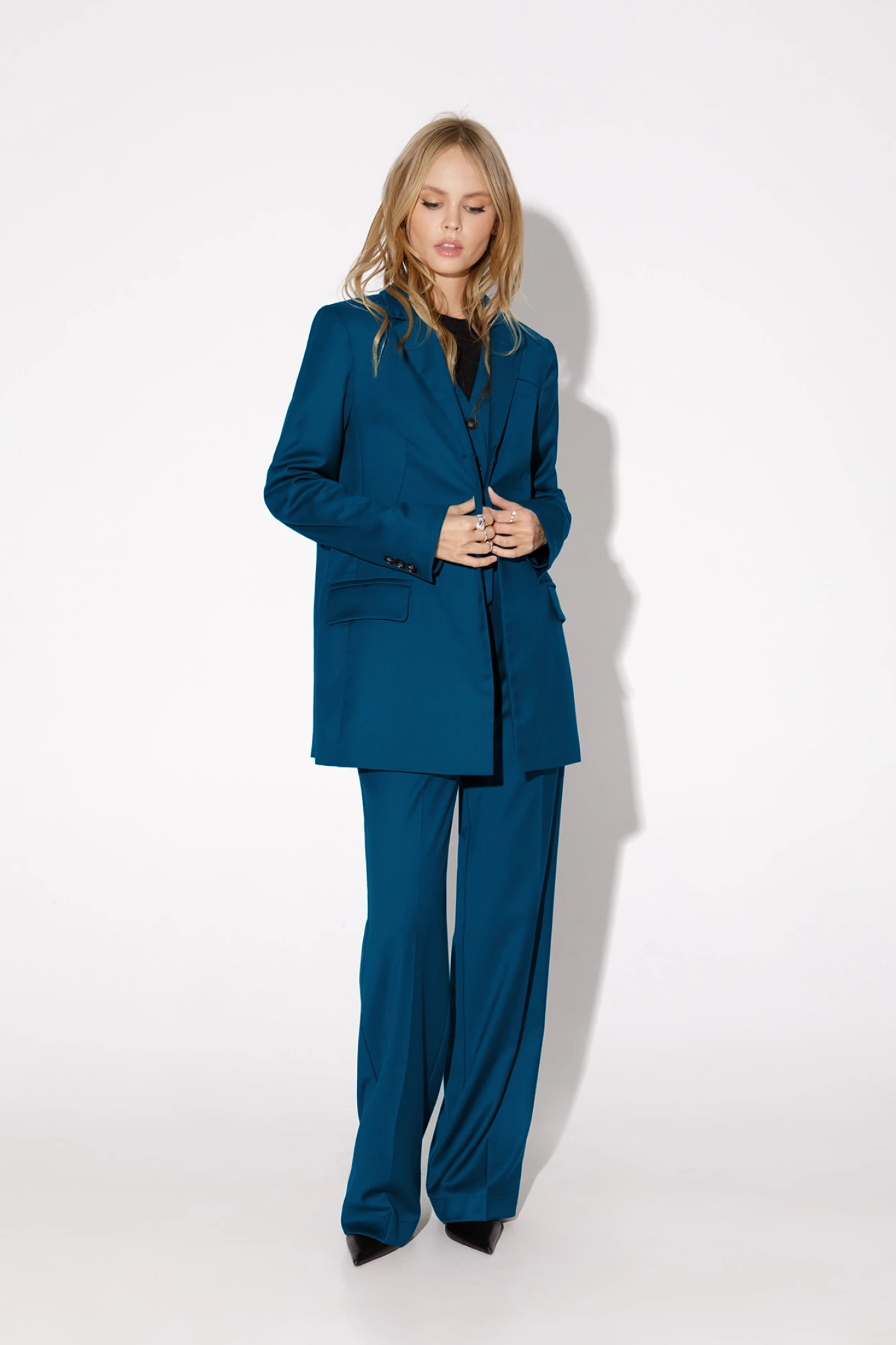 Текстильный костюм-двойка из трапециевидного жакета с высокой шлицей по спинке и прямых брюк со стрелками. Детали: свободный покрой, пиджачный воротник, талиевые вытачки, функциональный нагрудный карман, прорезные карманы с клапанами, застежка на пуговицы, спинка со средним швом и высокой шлицей, рукава втачные двухшовные, жакет на подкладке. Брюки с высокой посадкой на притачном поясе со шлевками, передние половины с небольшими застроченными мягкими складками и заутюженными стрелками, застежка на молнию и пуговицу, боковые карманы Длина жакета по спинке около 74/76 см, длина рукава около 61 см. Длина брюк по боковому шву с поясом около 113/114,5 см