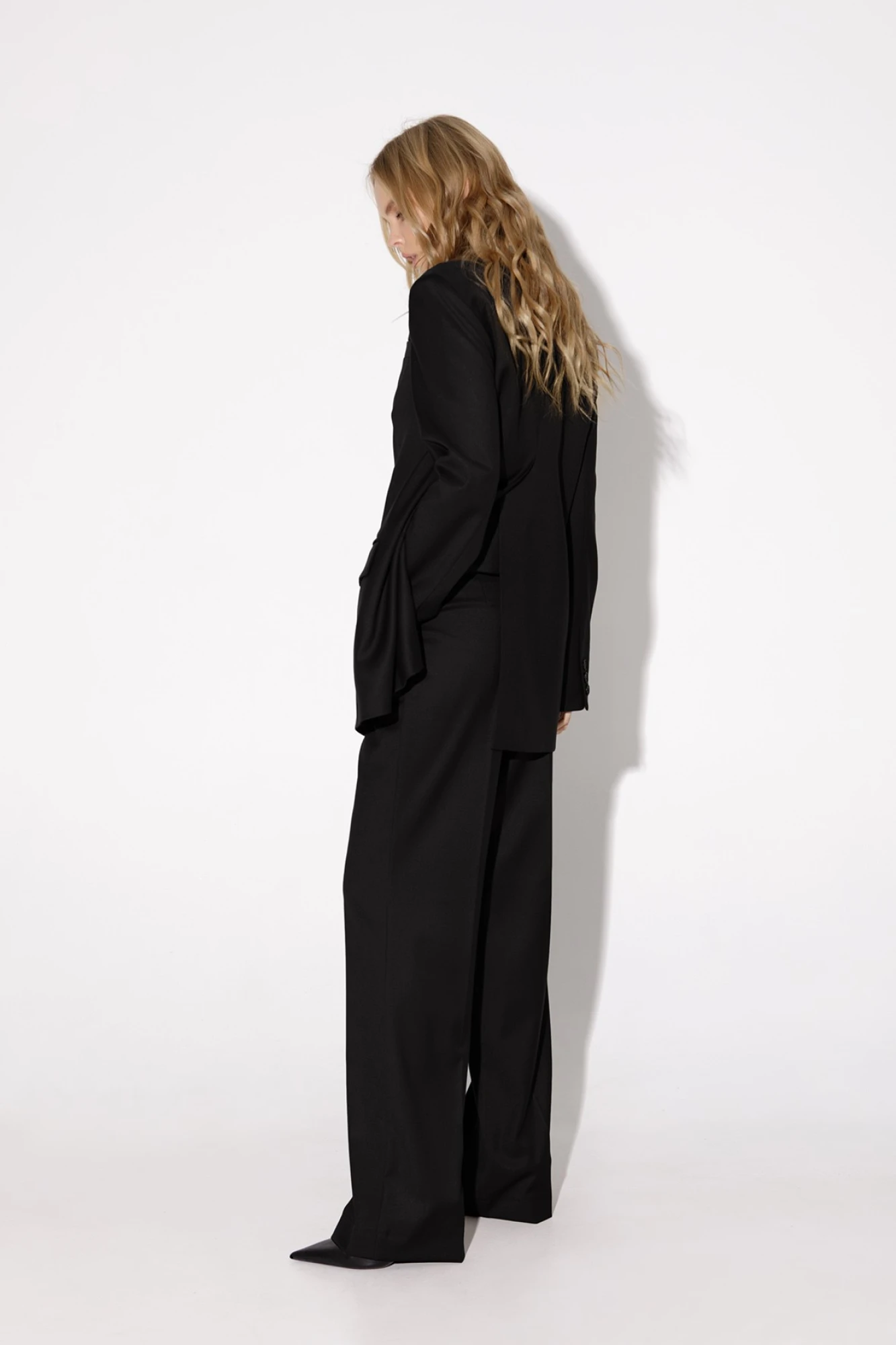 Текстильный костюм-тройка из трапециевидного жакета с высокой шлицей по спинке, полуприлегающего жилета и прямых брюк со стрелками. Детали: свободный покрой, пиджачный воротник, талиевые вытачки, функциональный нагрудный карман, прорезные карманы с клапанами, застежка на пуговицы, спинка со средним швом и высокой шлицей, рукава втачные двухшовные, жакет на подкладке. Жилет полуприлегающего силуэта, талиевые вытачками, застежка на петли и пуговицы, функциональные карманы, фигурный низ, на подкладке. Брюки с высокой посадкой на притачном поясе со шлевками, передние половины с небольшими застроченными мягкими складками и заутюженными стрелками, застежка на молнию и пуговицу, боковые карманы Длина жакета по спинке около 74/76 см, длина рукава около 61 см; длина жилета по спинке около 48,5/51,5 см; длина брюк по боковому шву с поясом около 113/114,5 см