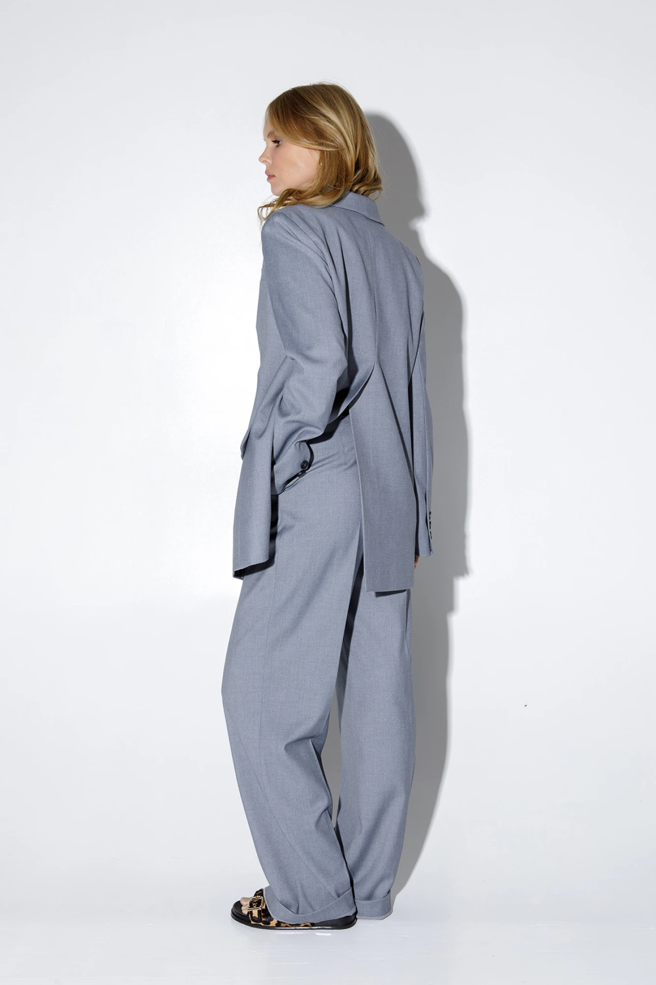 Текстильный костюм-тройка из трапециевидного жакета с высокой шлицей по спинке, полуприлегающего жилета и прямых брюк со стрелками. Детали: свободный покрой, пиджачный воротник, талиевые вытачки, функциональный нагрудный карман, прорезные карманы с клапанами, застежка на пуговицы, спинка со средним швом и высокой шлицей, рукава втачные двухшовные, жакет на подкладке. Жилет полуприлегающего силуэта, талиевые вытачками, застежка на петли и пуговицы, функциональные карманы, фигурный низ, на подкладке. Брюки с высокой посадкой на притачном поясе со шлевками, передние половины с небольшими застроченными мягкими складками и заутюженными стрелками, застежка на молнию и пуговицу, боковые карманы Длина жакета по спинке около 74/76 см, длина рукава около 61 см; длина жилета по спинке около 48,5/51,5 см; длина брюк по боковому шву с поясом около 113/114,5 см