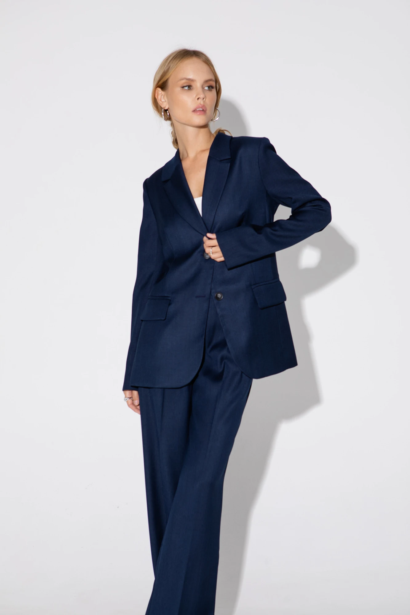 Текстильный костюм-двойка из свободного жакета со шлицами и широких прямых брюк. Детали: жакет полуприлегающего силуэта, талиевые вытачки, пиджачный воротник, застежка на две петли и пуговицы, функциональные карманы, рукава и спинка со шлицами, жакет на подкладке. Брюки с высокой посадкой на притачном поясе со шлевками, застежка на молнию и пуговицу, боковые карманы, передние половины с заутюженными стрелками и двумя небольшими складками Длина жакета по спинке около 70 см в размерах 40-46 и около 73 см в размерах 48-52, длина рукавов около 63 см. Длина брюк по боковому шву с поясом около 113 см в размерах 40-46 и около 114,5 см в размерах 48-52, длина по внутреннему шву около 82 см.