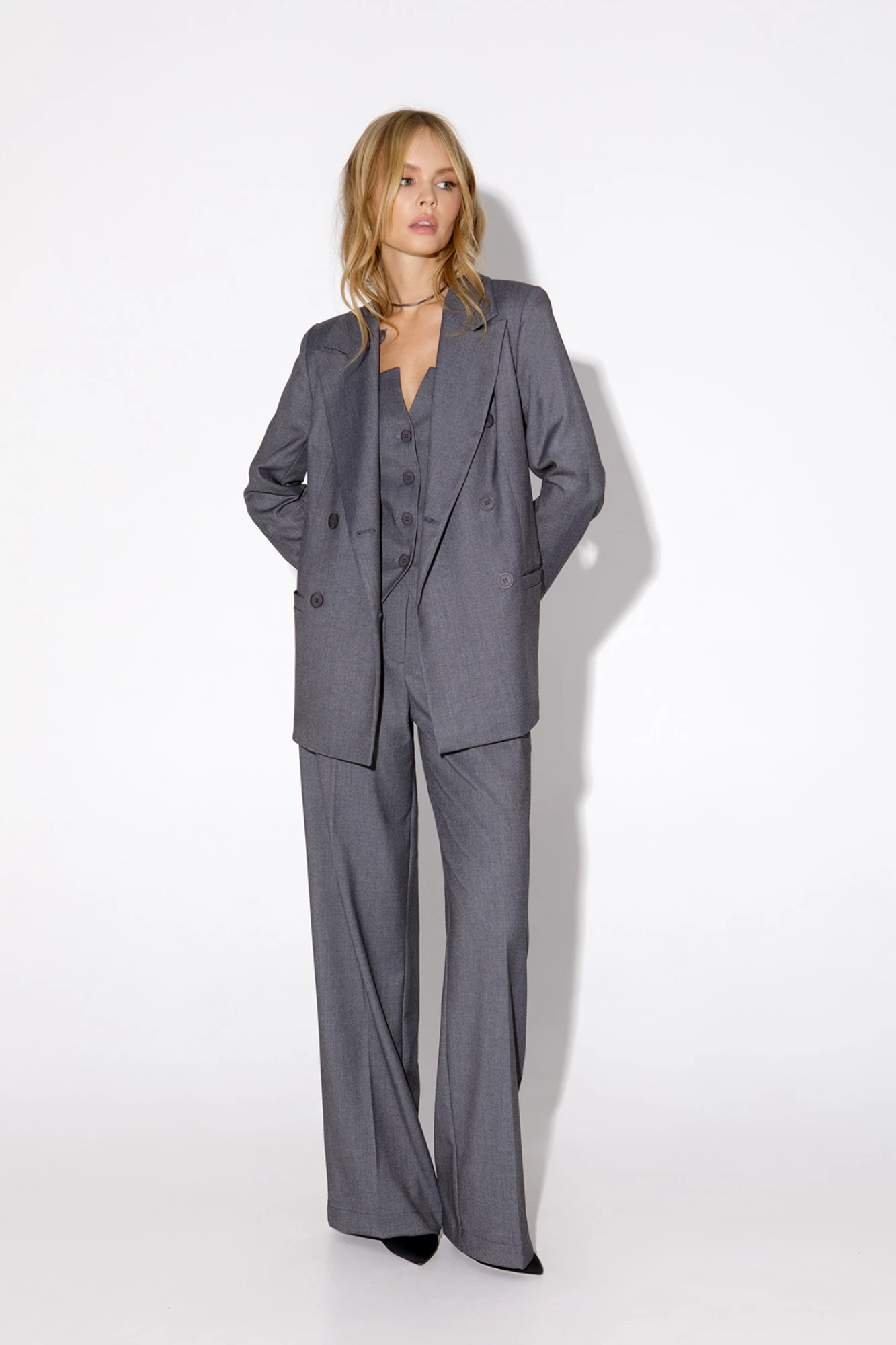 Текстильный костюм-тройка из классического двубортного жакета, топа-корсета и прямых брюк-палаццо со стрелками. Детали: жакет полуприлегающего силуэта, пиджачный воротник, перед с прорезными карманами, двубортная застежка на петли и пуговицы, спинка со средним швом, рукава втачные двухшовные, жакет на подкладке. Топ-корсет прилегающего силуэта, рельефные швы с регилином, функциональные карманы, застежка по переду на петли и пуговицы, спинка с эластичной вставкой, фигурный низ. Брюки с высокой посадкой на притачном поясе со шлевками, застежка на молнию и пуговицу, боковые карманы, передние половины с заутюженными стрелками и двумя небольшими складками. Длина жакета по спинке около 66 см в размерах 40-46 и около 69 см в размерах 48-52, длина рукавов около 61 см. Длина топа по спинке около 27,5 см в размерах 40-46 и около 29 см в размерах 48-52. Длина брюк по боковому шву с поясом около 113 см в размерах 40-46 и около 114,5 см в размерах 48-52, длина по внутреннему шву около 82 см.