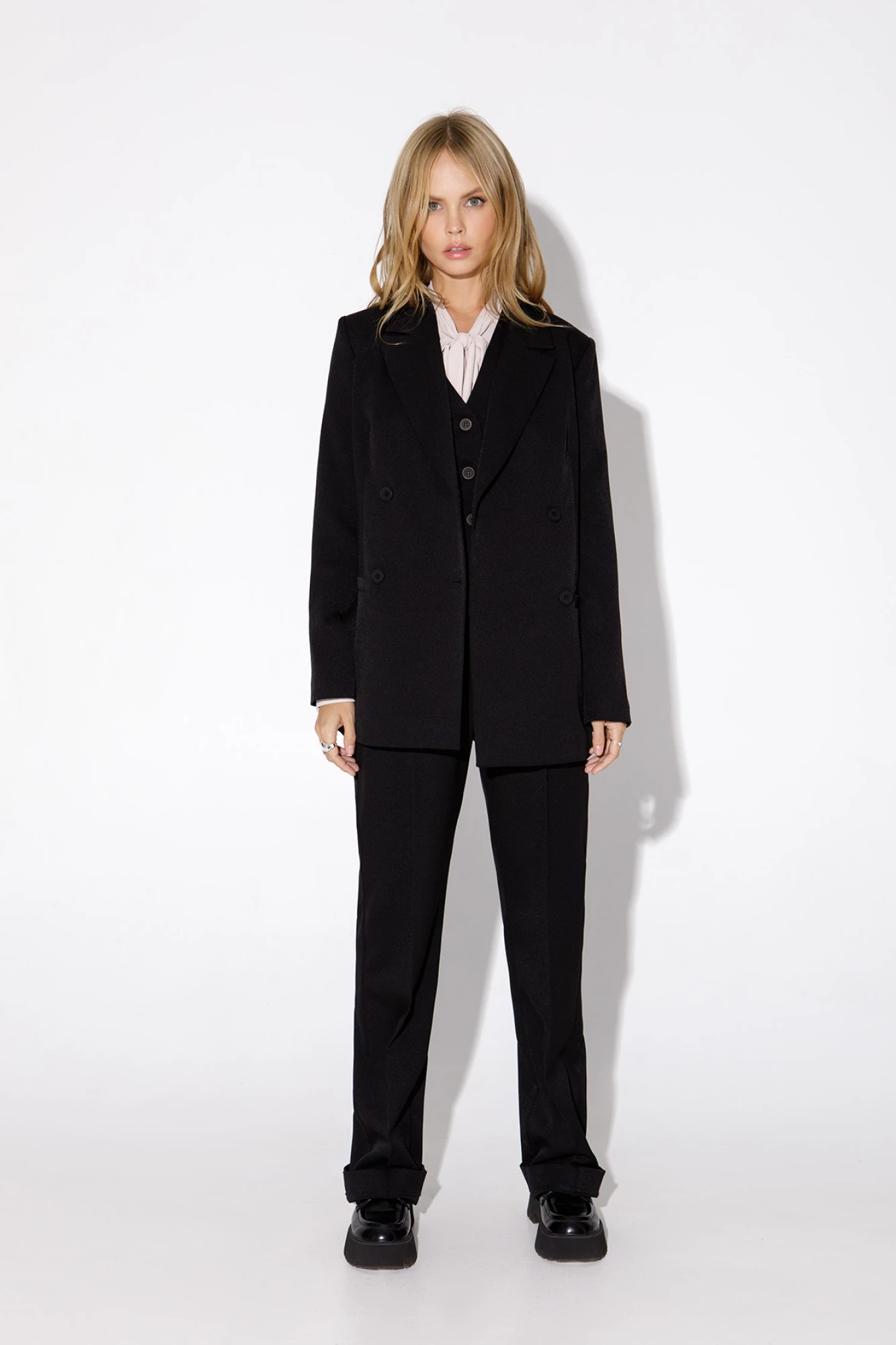 Текстильный костюм-тройка из двубортного оверсайз жакета, полуприлегающего жилета и прямых брюк с высокой посадкой. Детали: жакет прямого силуэта, пиджачный воротник, прорезные карманы, спинка со средним швом, втачные двухшовные рукава, жакет на подкладке. Жилет с талиевыми вытачками, застежка на петли и пуговицы, функциональные карманы, фигурный низ, на подкладке. Брюки на притачном поясе со шлевками, передние половины с небольшими мягкими складками и заутюженными стрелками, застежка на молнию и пуговицу, боковые карманы. Длина жакета по спинке около 70 см в размерах 40-46 и около 73 см в размерах 48-52, длина рукавов около 62 см. Длина жилета по спинке около 48,5/51,5 см. Длина брюк по боковому шву с поясом около 112,5 в размерах 40-46 и около 114 см в размерах 48-52, длина по внутреннему шву около 80 см.