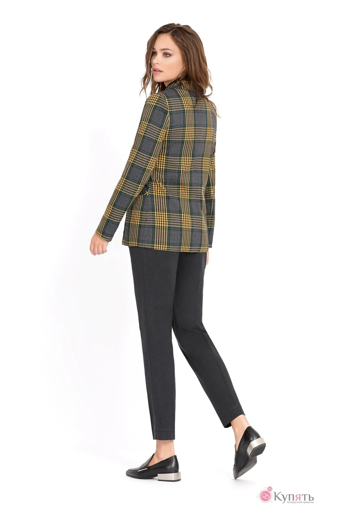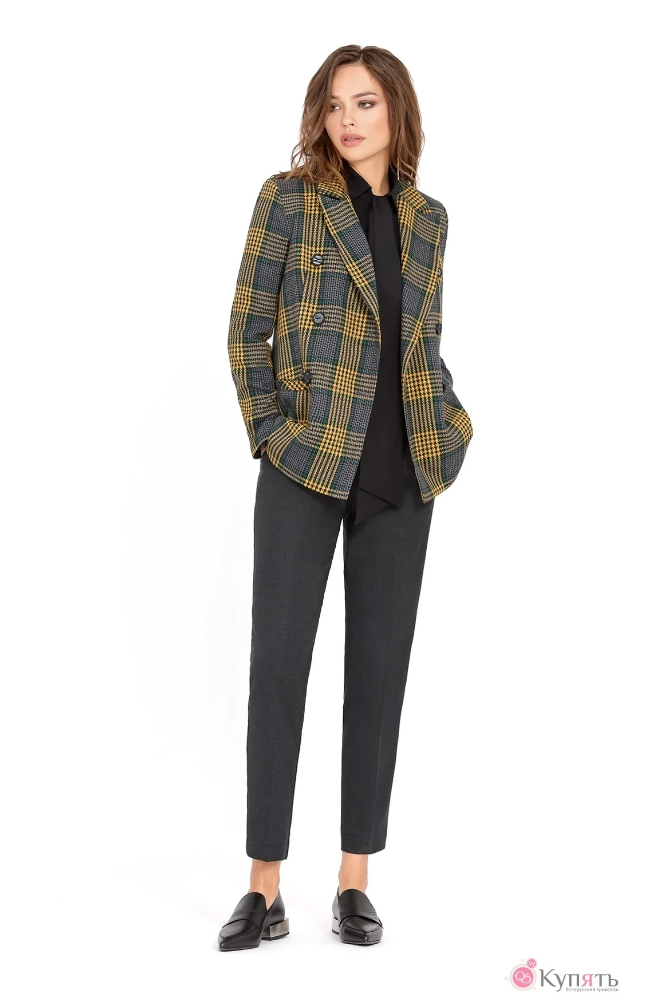 Текстильный костюм из двубортного блейзера «мужского» покроя в крупную клетку и однотонных укороченных брюк. Детали: прямой силуэт, пиджачный воротник, прорезные карманы, спинка со средним швом, втачные двухшовные рукава; брюки со средней посадкой, застежка на молнию и пуговицу, боковые карманы, передние половины с заутюженными стрелками и двумя небольшими складками.