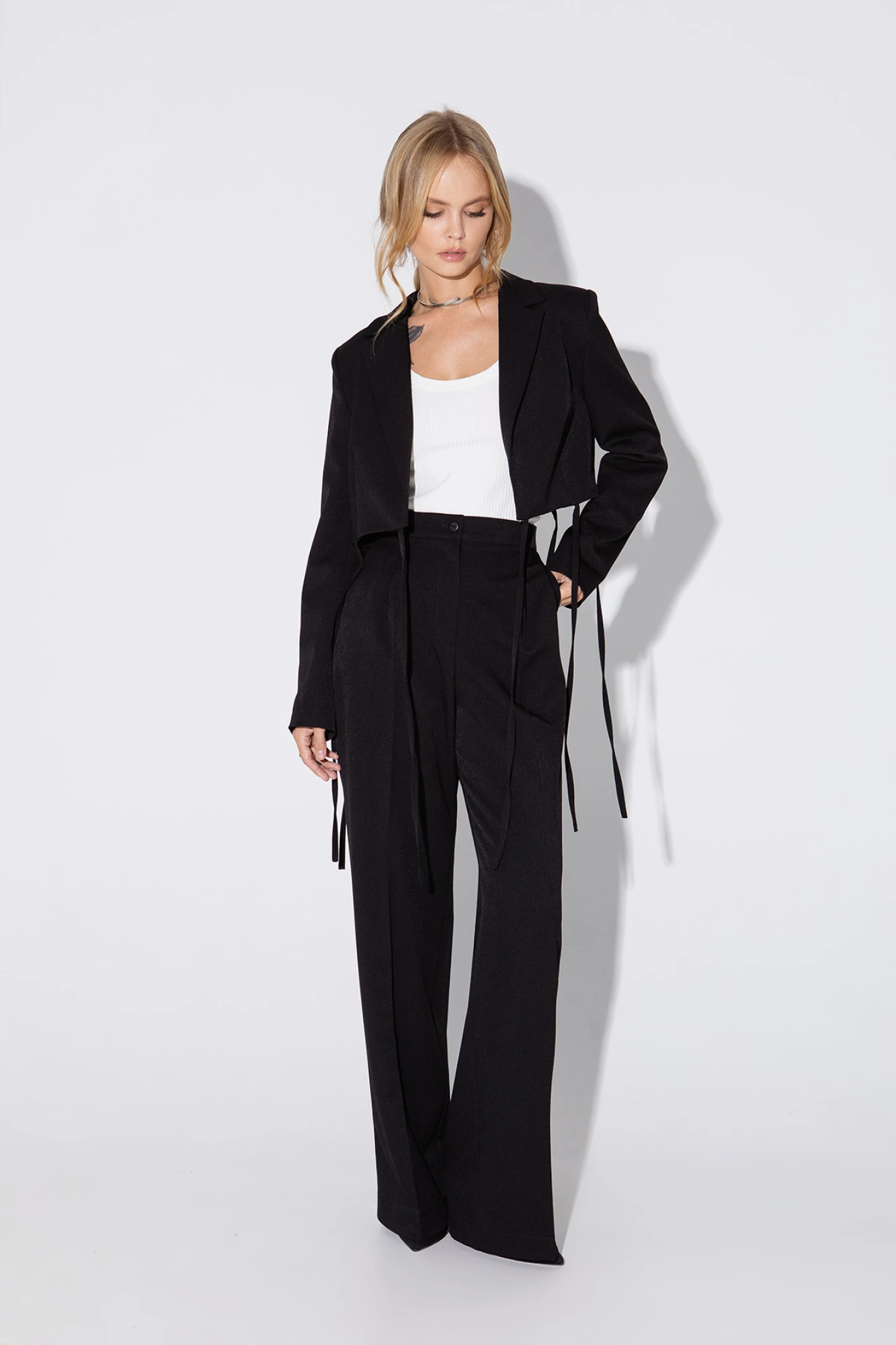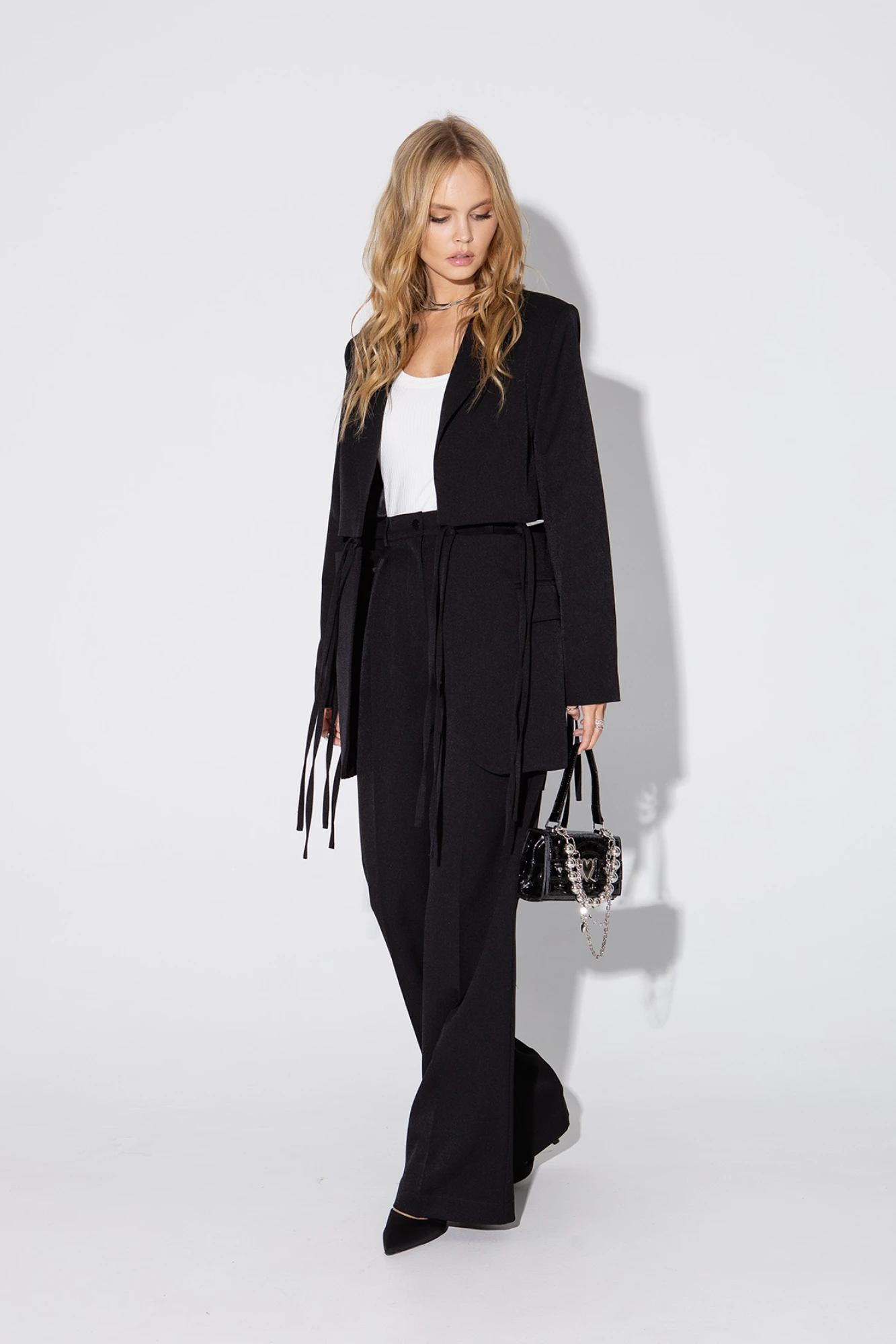 Комплект- тройка из свободного жакета с отделкой, базовой трикотажной майки и брюк-палаццо со стрелками. Детали: жакет прямого силуэта, пиджачный воротник, талиевые вытачки, прорезные карманы с клапанами, спинка со средним швом, рукава втачные двухшовные, жакет на подкладке. Майка из трикотажа- «лапша», глубокие вырезы горловины и пройм. Брюки с высокой посадкой на притачном поясе со шлевками, застежка на молнию и пуговицу, боковые карманы, передние половины с заутюженными стрелками и двумя небольшими складками. Длина жакета по спинке около 76 см в размерах 40-46 и около 79 см в размерах 48-52, длина рукавов около 61 см. Длина майки от плечевого шва около 37 см в размерах 40-46 и около 39 см в размерах 48-52. Длина брюк по боковому шву с поясом около 113 см в размерах 40-46 и около 114,5 см в размерах 48-52, длина по внутреннему шву около 82 см.