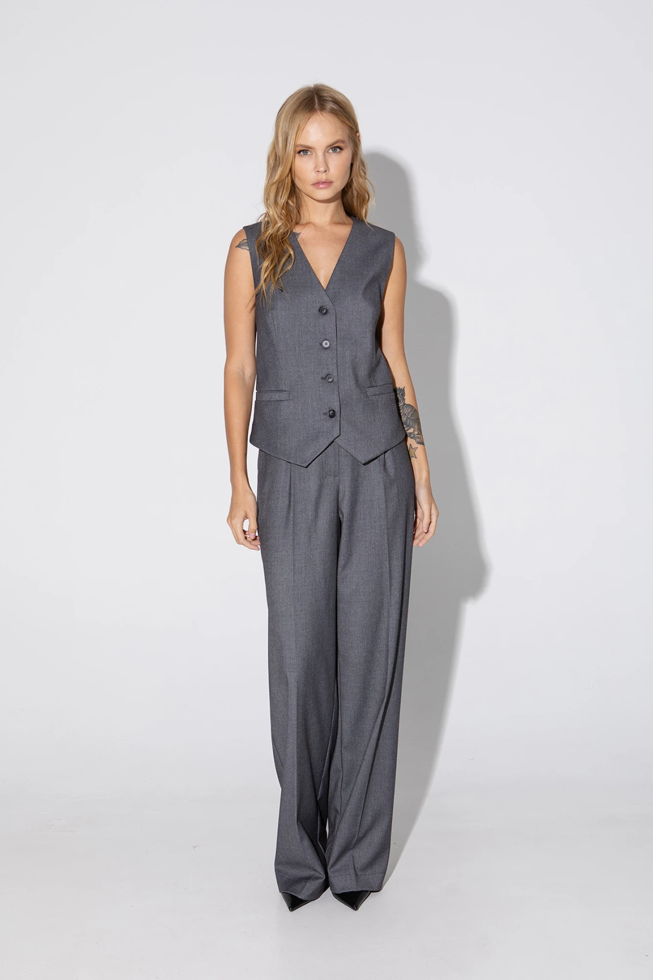 Текстильный костюм-двойка из полуприлегающего жилета и прямых брюк со стрелками. Детали: жилет полуприлегающего силуэта, талиевые вытачками, застежка на петли и пуговицы, функциональные карманы, фигурный низ, на подкладке. Брюки с высокой посадкой на притачном поясе со шлевками, передние половины с небольшими застроченными мягкими складками и заутюженными стрелками, застежка на молнию и пуговицу, боковые карманы. Длина жилета по спинке около 48,5/51,5 см. Длина брюк по боковому шву с поясом около 113/114,5 см.