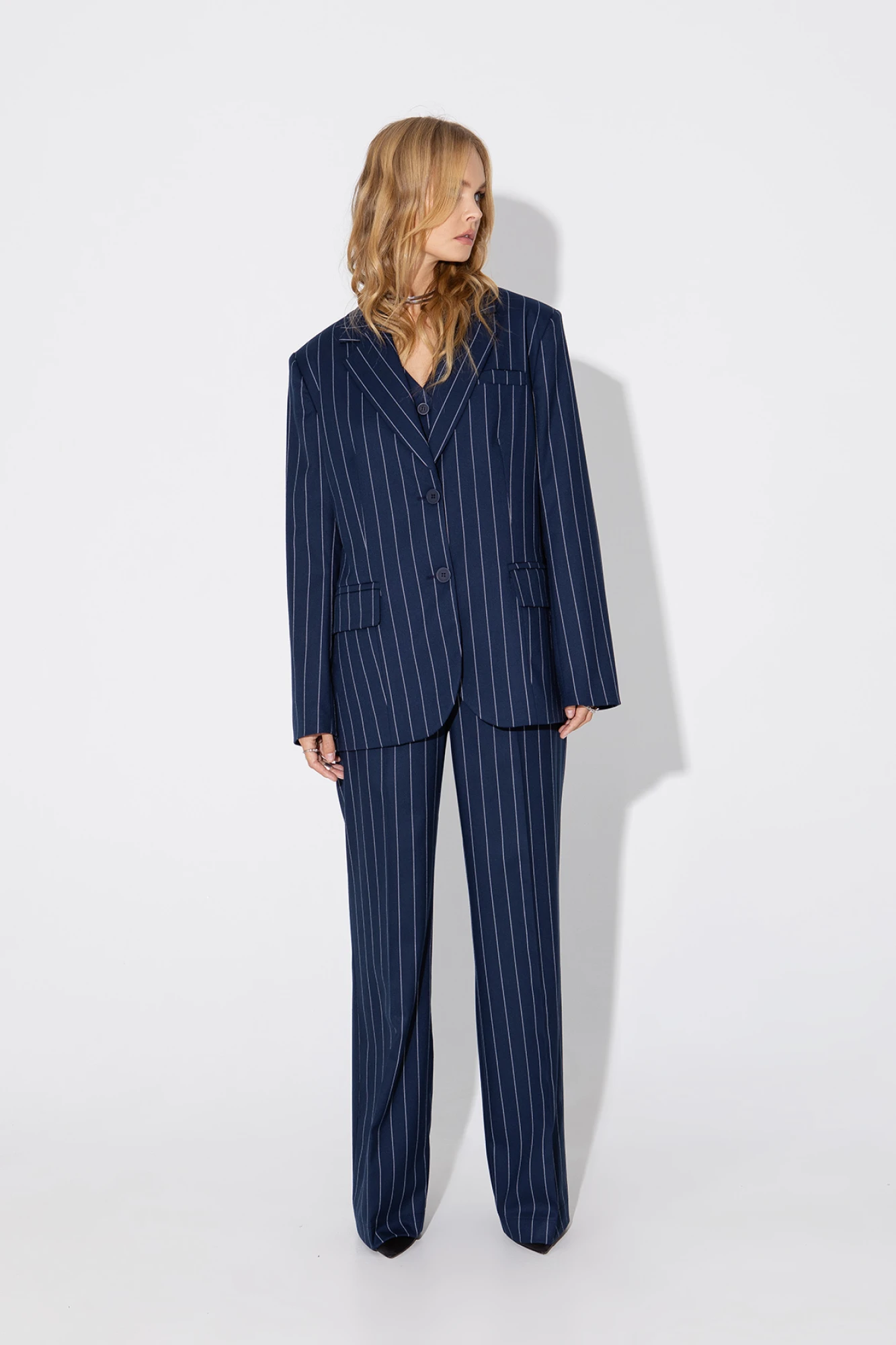 Текстильный костюм-двойка из оверсайз жакета и прямых брюк-палаццо со стрелками. Детали: жакет прямого силуэта, расширенная линия плеч, пиджачный воротник, перед с прорезными функциональными карманами, однобортная застежка на петли и пуговицы, спинка со средним швом и шлицей, рукава втачные двухшовные, жакет на подкладке. Брюки с высокой посадкой на притачном поясе со шлевками, застежка на молнию и пуговицу, боковые карманы, передние половины с заутюженными стрелками и двумя небольшими складками. Длина жакета по спинке около 69 см в размерах 40-46 и около 72 см в размерах 48-52, длина рукавов около 62 см. Длина брюк по боковому шву с поясом около 113 см в размерах 40-46 и около 114,5 см в размерах 48-52, длина по внутреннему шву около 82 см.