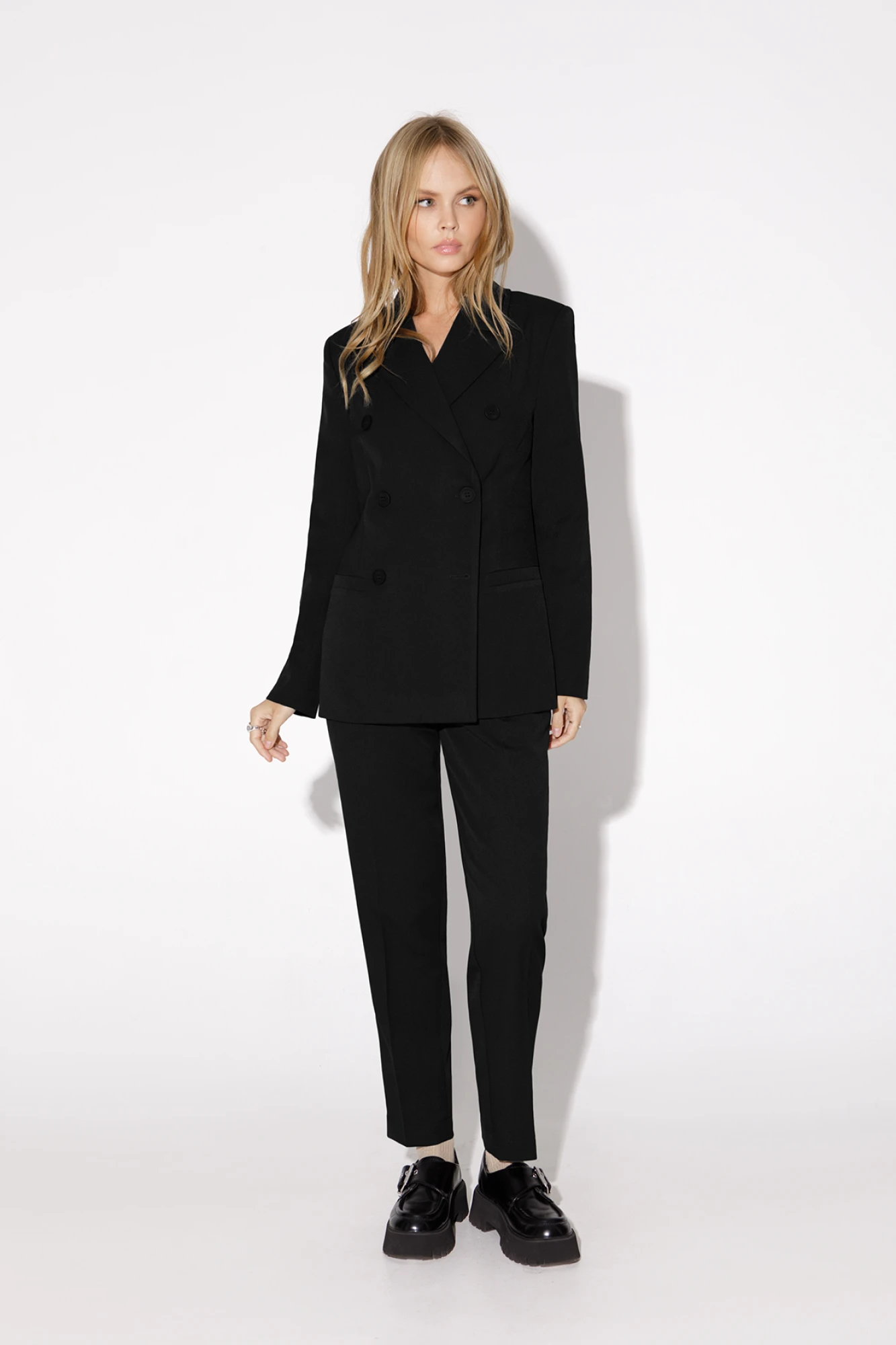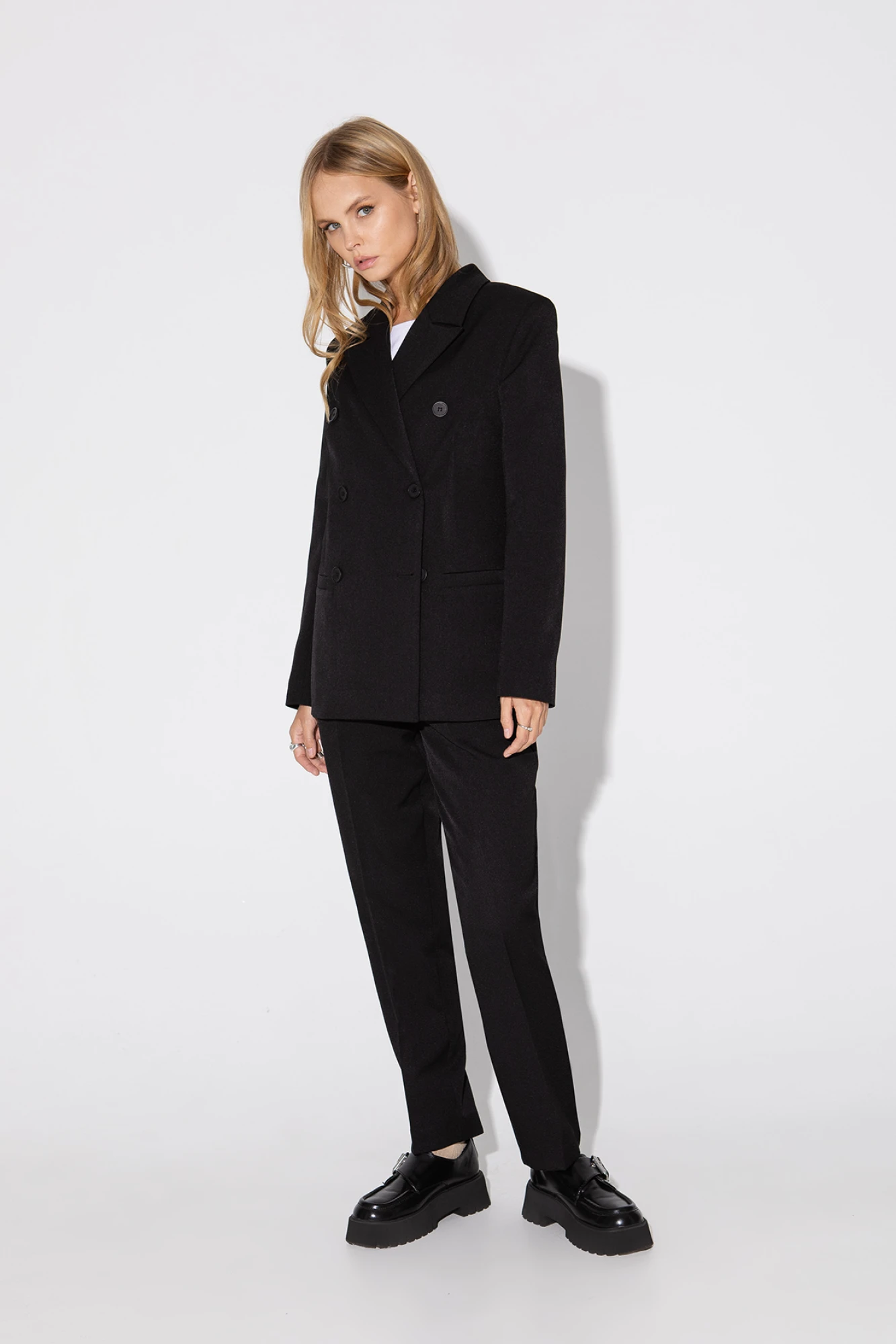 Классический костюм-двойка из двубортного жакета и укороченных брюк со стрелками. Детали: жакет полуприлегающего силуэта, пиджачный воротник, перед с прорезными карманами, двубортная застежка на петли и пуговицы, спинка со средним швом, рукава втачные двухшовные, жакет на подкладке. Брюки со средней посадкой, притачной пояс со шлевками, передние половины с небольшими мягкими складками и заутюженными стрелками, застежка на молнию и пуговицу, боковые карманы. Длина жакета по спинке около 66 см в размерах 40-46 и около 69 см в размерах 48-52, длина рукавов около 61 см. Длина брюк по боковому шву с поясом около 97 в размерах 40-46 и около 98,5 см в размерах 48-52, длина по внутреннему шву около 70 см.