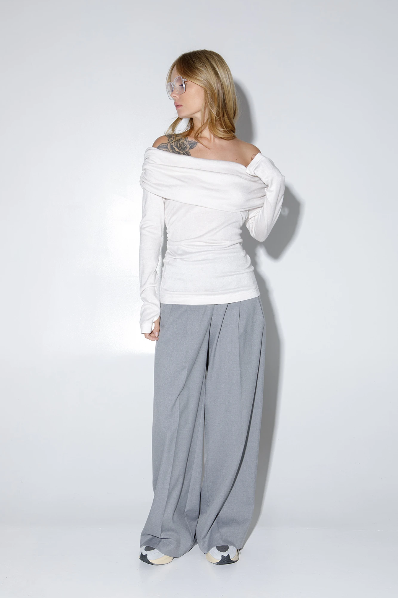 Комплект-двойка из трикотажного джемпера с открытыми плечами и текстильных брюк-палаццо с небольшими складками у пояса и стрелками. Детали: джемпер прилегающего силуэта, длинные рукава с прорезями для пальцев, боковые швы со сборкой. Брюки с притачным поясом со шлевками, застежка на молнию и пуговицу, боковые карманы. Задние части брюк с вытачками и имитацией карманов. Брюки из плотной текстильной ткани в рубчик. Длина брюк по боковому шву с поясом около 109,5 см, длина по внутреннему шву около 83 см