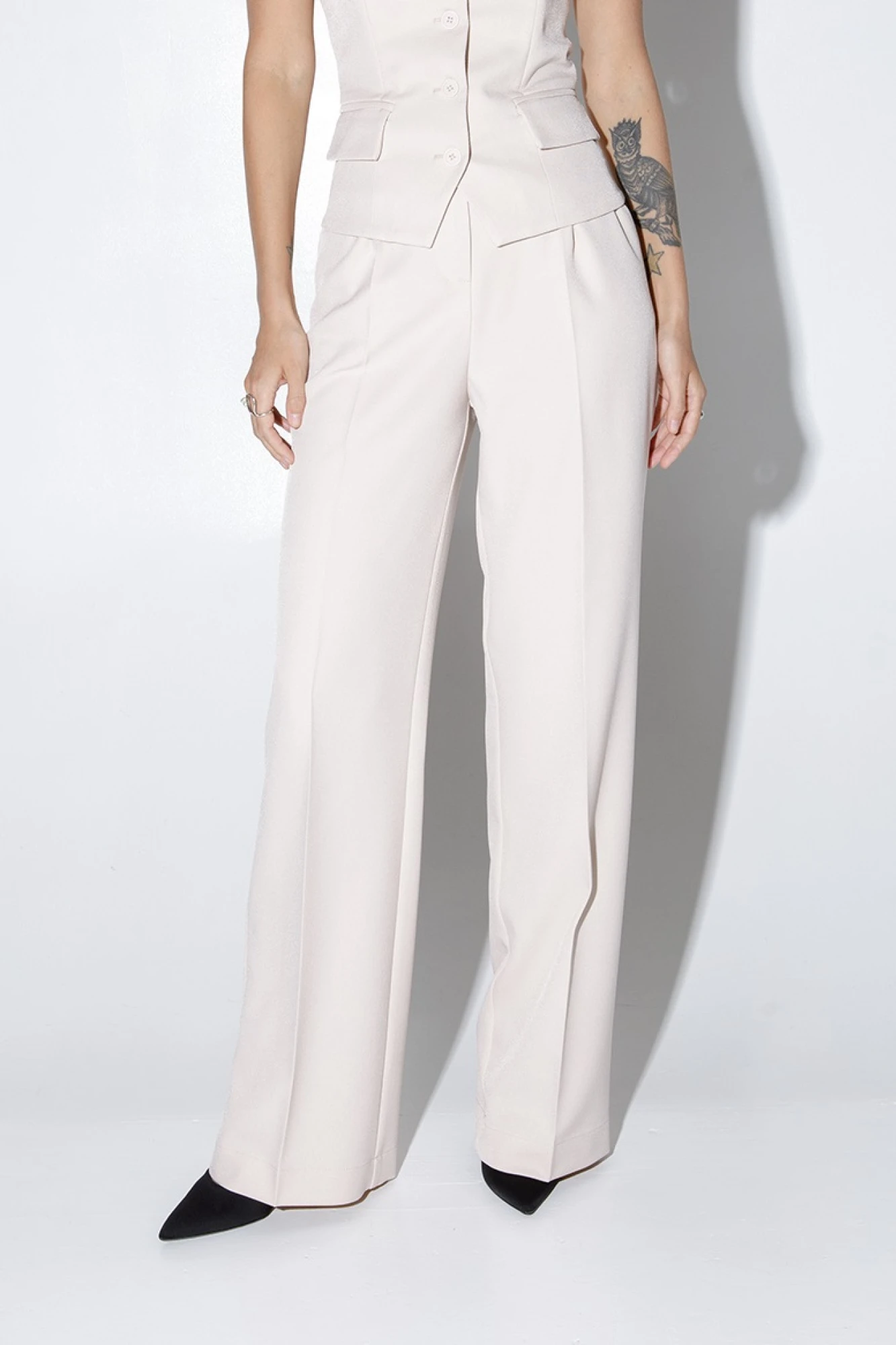 Текстильный костюм-двойка из приталенного жакета свободного покроя с разрезами по рукавам и прямых брюк-палаццо со стрелками. Детали: жакет прилегающего силуэта, пиджачный воротник, рельефные швы, перед с прорезными карманами, застежка на петли и пуговицы, спинка со средним швом, рукава втачные двухшовные с высоким разрезом по низу рукавов, жакет на подкладке. Брюки с высокой посадкой на притачном поясе со шлевками, пояс прямой без резинки, застежка на молнию и пуговицу, боковые карманы, передние половины с заутюженными стрелками и двумя небольшими складками. Задние части брюк с вытачками и заутюженными стрелками. Длина жакета по спинке около 69 см в размерах 40-46 и около 71 см в размерах 48-50, длина рукавов около 64 см. Длина брюк по боковому шву с поясом около 113 см в размерах 40-46 и около 114,5 см в размерах 48-52, длина по внутреннему шву около 82 см.