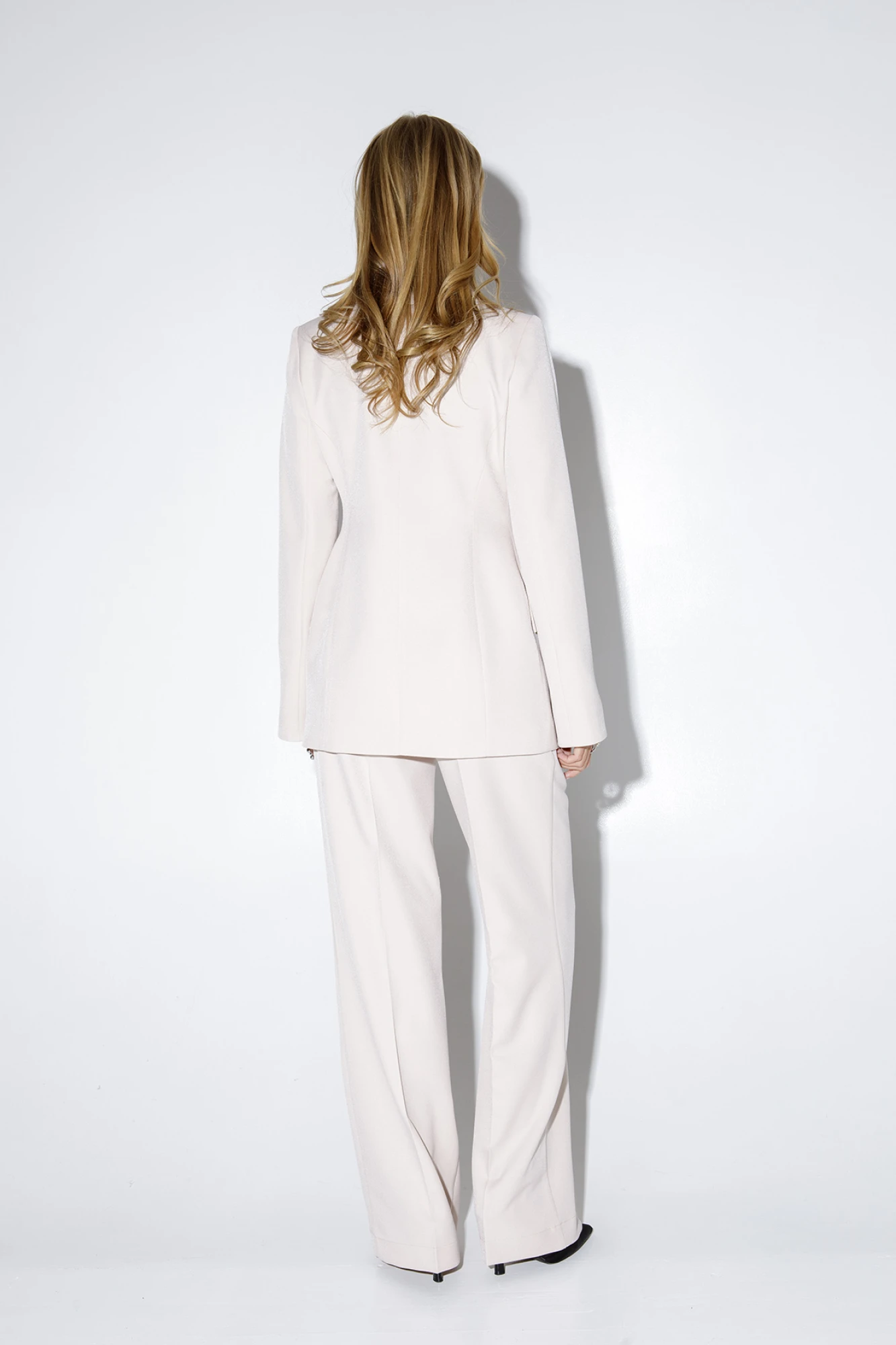 Текстильный костюм-тройка из приталенного жакета свободного покроя с разрезами по рукавам, топа-корсета и прямых брюк-палаццо со стрелками. Детали: жакет прилегающего силуэта, пиджачный воротник, рельефные швы, перед с прорезными карманами, застежка на петли и пуговицы, спинка со средним швом, рукава втачные двухшовные с высоким разрезом по низу рукавов, жакет на подкладке. Топ-корсет прилегающего силуэта, рельефные швы с регилином, функциональные карманы, застежка по переду на петли и пуговицы, спинка с эластичной вставкой, фигурный низ. Брюки с высокой посадкой на притачном поясе со шлевками, пояс прямой без резинки, застежка на молнию и пуговицу, боковые карманы, передние половины с заутюженными стрелками и двумя небольшими складками. Задние части брюк с вытачками и заутюженными стрелками. Длина жакета по спинке около 64 см в размерах 40-46 и около 67 см в размерах 48-50, длина рукавов около 64 см. Длина топа по спинке около 27,5 см в размерах 40-46 и около 29 см в размерах 48-52. Длина брюк по боковому шву с поясом около 113 см в размерах 40-46 и около 114,5 см в размерах 48-52, длина по внутреннему шву около 82 см.