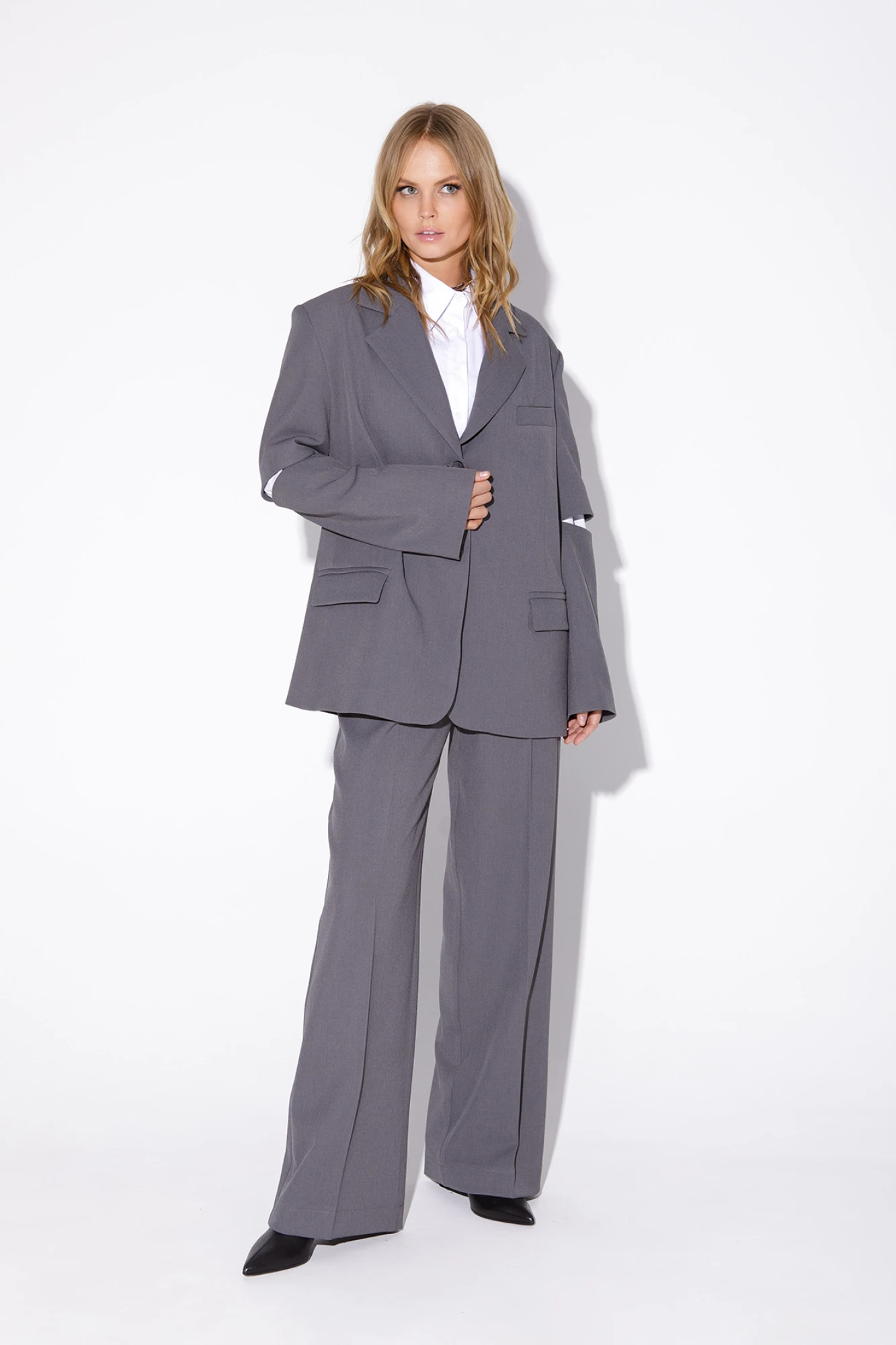 Текстильный костюм-двойка из оверсайз жакета с разрезами по рукавам и прямых широких брюк со стрелками. Детали: жакет свободного покроя, прямой силуэт, застежка на петли и пуговицы, функциональные карманы, жакет на подкладке. Брюки с притачным поясом со шлевками, передние половины с небольшими застроченными мягкими складками и заутюженными стрелками, застежка на молнию и пуговицу, боковые карманы. Задние части брюк с вытачками и заутюженными стрелками. Пояс брюк прямой, без резинки. Длина жакета по спинке около 71 см в размерах 40-48 и около 73 см в размерах 50-52, длина рукава около 61 см. Длина брюк по боковому шву с поясом около 114 см в размерах 40-46 и около 115,5 см в размерах 48-52. Длина по внутреннему шву около 83 см