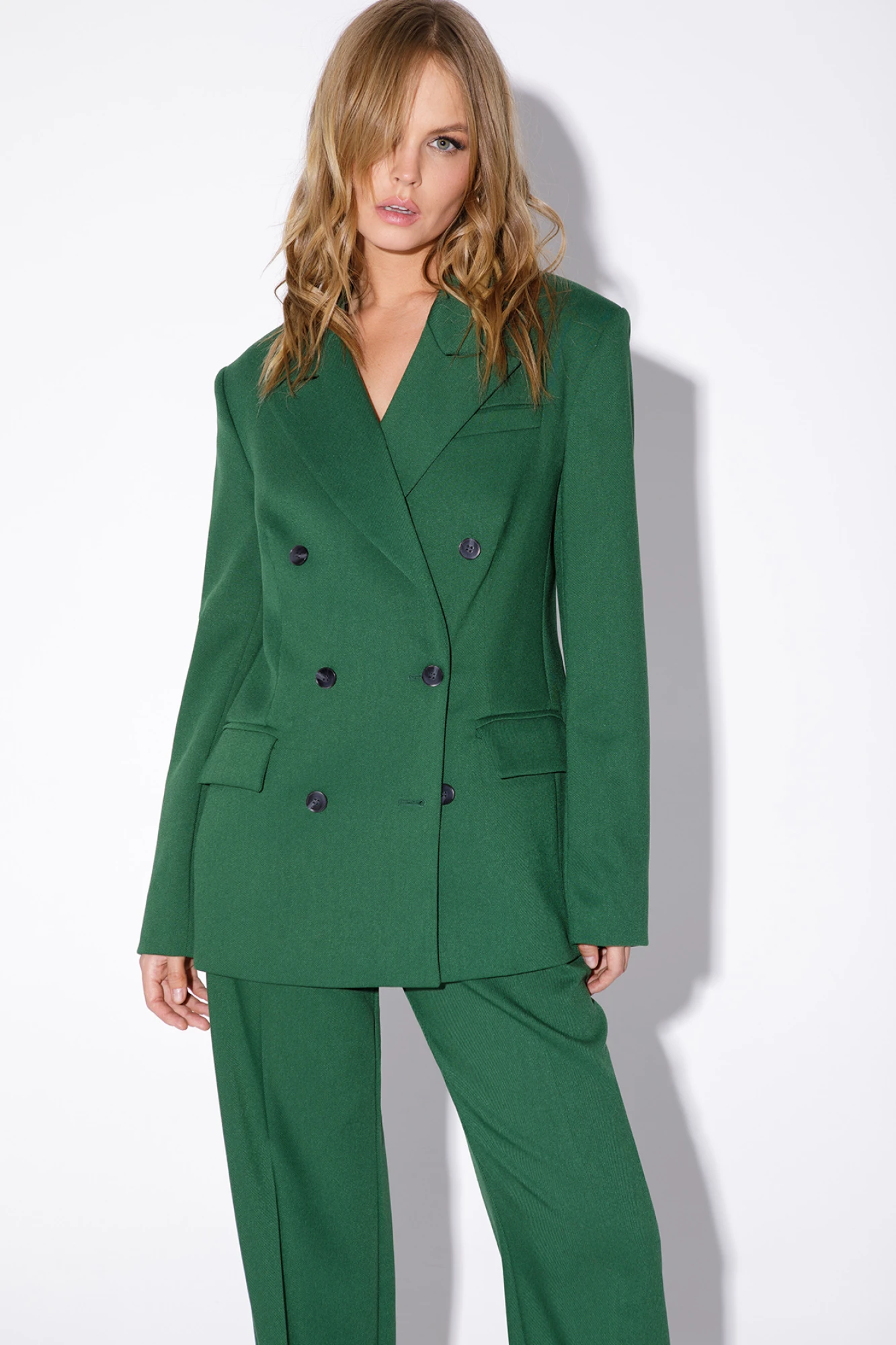 Текстильный костюм-тройка из свободного жакета, жилета свободного силуэта и прямых брюк со стрелками. Детали: жакет свободного покроя и полуприлегающего силуэта, двубортная застежка на петли и пуговицы, отрезные бочки, пиджачный воротник, функциональные карманы, жакет на подкладке. Жилет с талиевыми вытачками, спинка со средним швом и рельефами, застежка на петли и пуговицы, функциональные карманы, на подкладке, прилегание по талии регулируется хлястиками на спинке. Брюки с высокой посадкой, притачной пояс со шлевками, передние половины с небольшими застроченными мягкими складками и заутюженными стрелками, застежка на молнию и пуговицу, боковые карманы. Задние части брюк с вытачками и заутюженными стрелками. Пояс брюк прямой, без резинки. Длина жакета по спинке около 69 см в размерах 40-46 и около 72 см в размерах 48-52, длина рукавов около 62 см. Длина жилета по спинке около 46 см в размерах 40-46 и около 49 см в размерах 48-52. Длина брюк по боковому шву с поясом около 114 в размерах 40-46 и около 115,5 см в размерах 48-52. Длина по внутреннему шву около 83 см