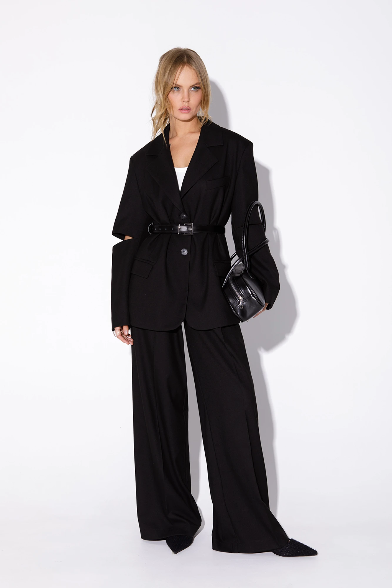 Текстильный костюм-двойка из оверсайз жакета с разрезами по рукавам и широких брюк-палаццо. Детали: жакет свободного покроя, прямой силуэт, застежка на петли и пуговицы, функциональные карманы, жакет на подкладке. Брюки с притачным поясом со шлевками, перед со складками и заутюженными стрелками, застежка на молнию и пуговицу, боковые карманы. Задние части брюк с вытачками и имитацией карманов. Длина жакета по спинке около 71 см в размерах 40-48 и около 73 см в размерах 50-52, длина рукава около 61 см. Длина брюк по боковому шву с поясом около 109,5 см, длина по внутреннему шву около 83 см