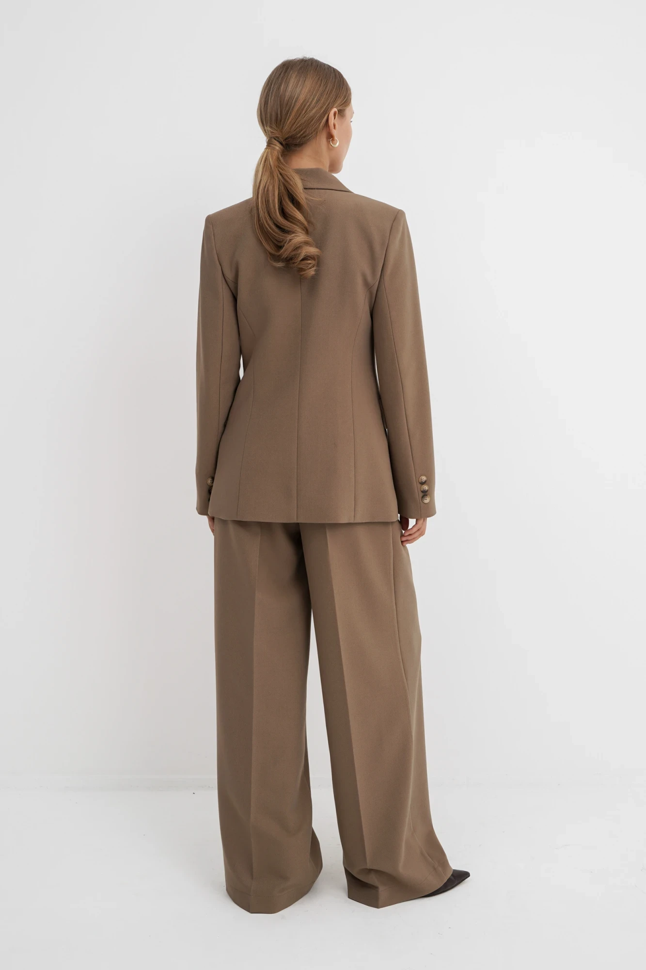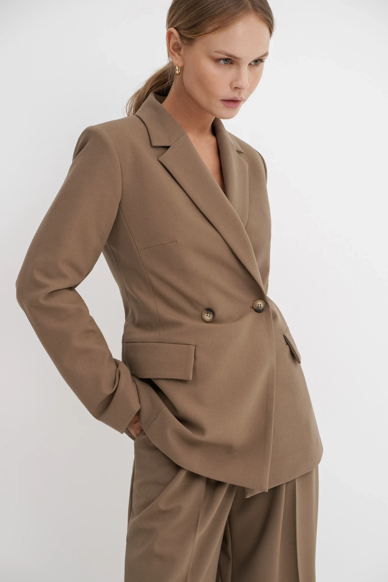 Текстильный костюм-тройка из приталенного двубортного жакета, полуприлегающего жилета и широких брюк-палаццо. Детали: жакет с отрезными бочками и нагрудными вытачками, пиджачный воротник, прорезные карманы, застежка на петли и пуговицы, спинка со средним швом, втачные двухшовные рукава, жакет на подкладке. Жилет полуприлегающего силуэта, талиевые вытачками, застежка на петли и пуговицы, функциональные карманы, фигурный низ, на подкладке. Брюки с притачным поясом со шлевками, складки у пояса, застежка на молнию и пуговицу, боковые карманы. Задние части брюк с вытачками и имитацией карманов. Длина жакета по спинке около 68 см в размерах 40-46 и около 71 см в размерах 48-52, длина рукава около 61 см. Длина жилета по спинке около 48,5 см в размерах 40-46 и около 51,5 см в размерах 48-52. Длина брюк по боковому шву с поясом около 109,5 см, длина по внутреннему шву около 83 см.
