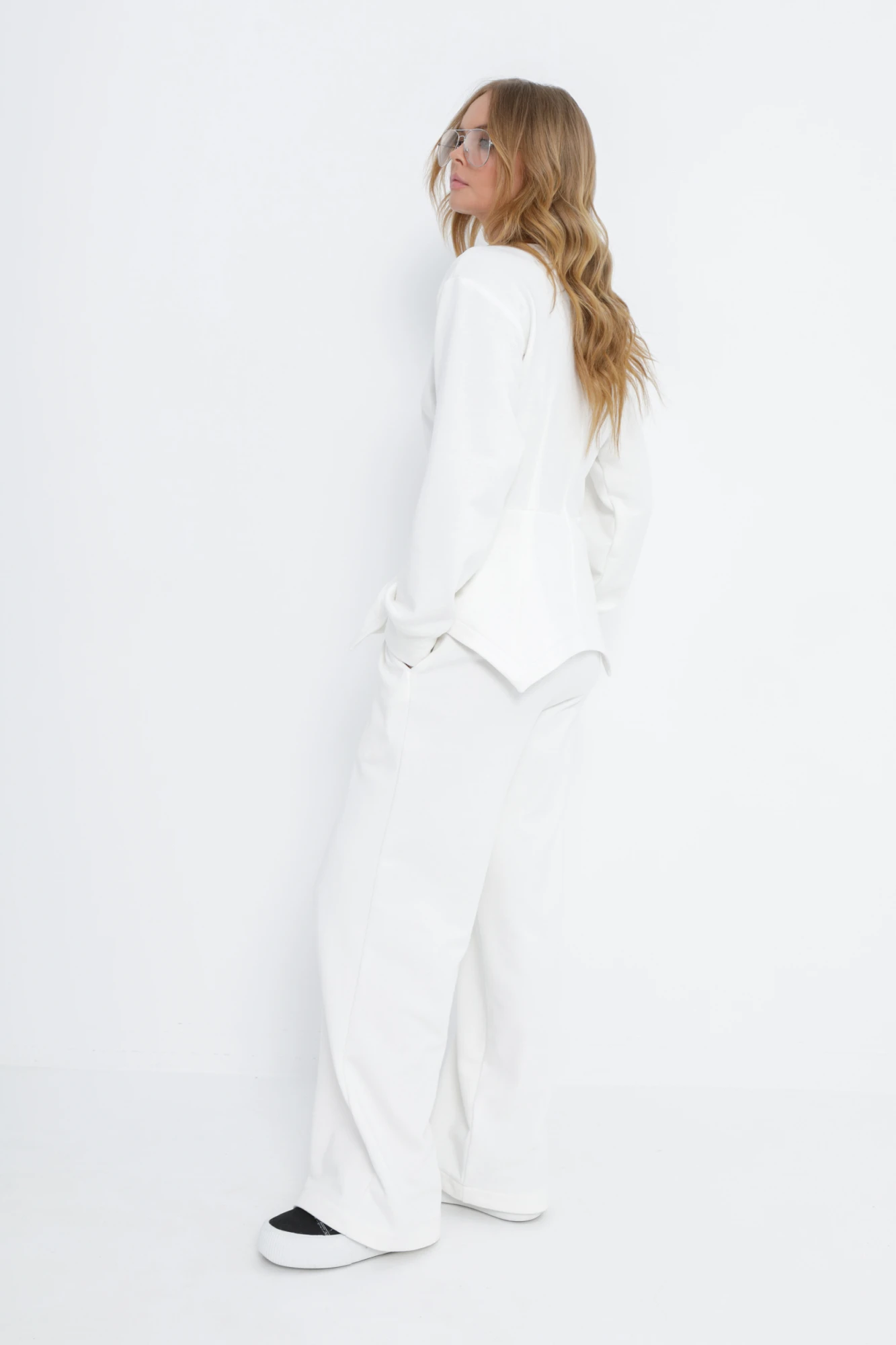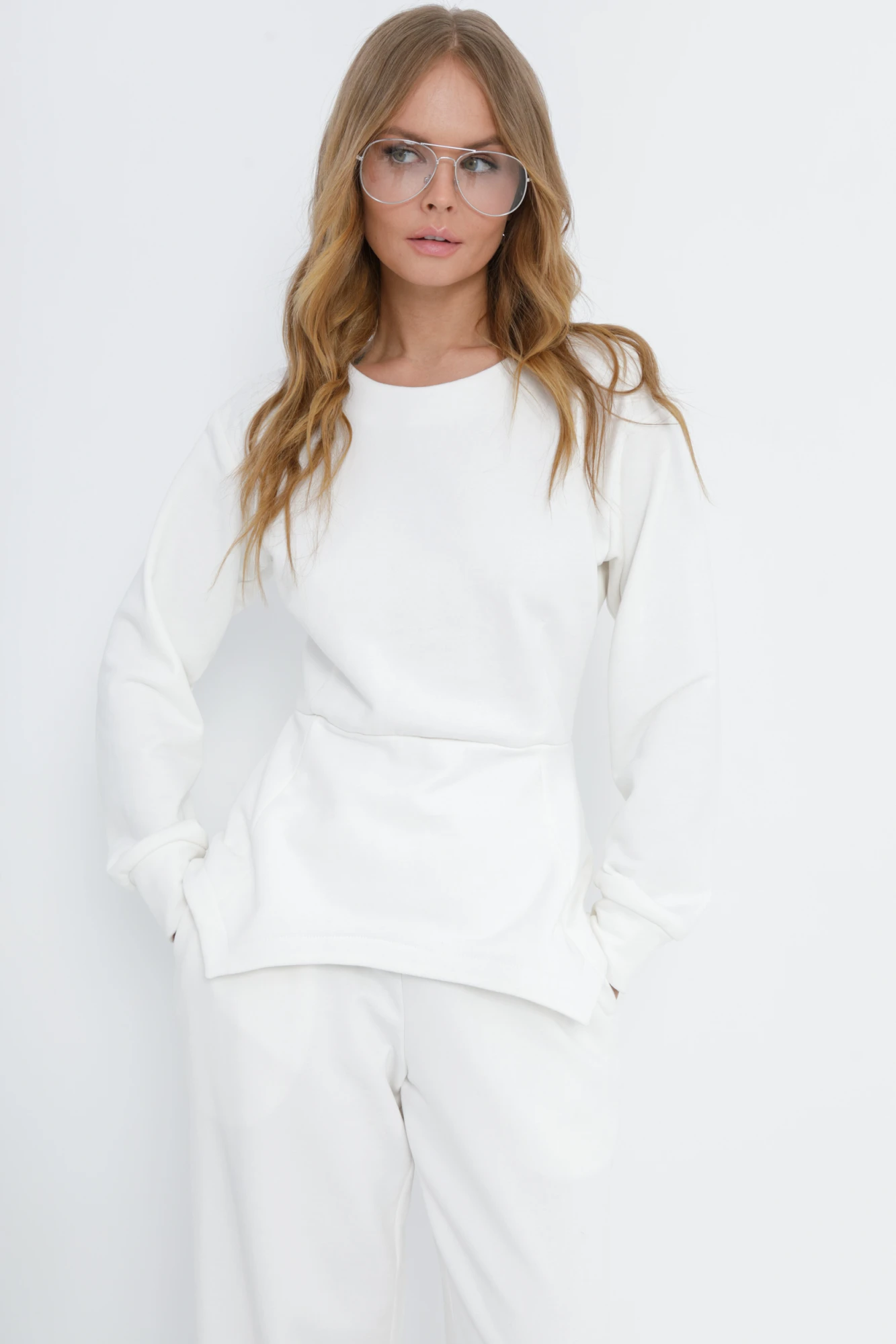 Трикотажный костюм-двойка из приталенного джемпера и свободных брюк. Детали: джемпер полуприлегающего силуэта, спущенная линия плеча, круглый вырез горловины, талия на резинке, застежка на потайную молнию в среднем шве спинки, рукава длинные с манжетами, фигурный низ. Брюки с высокой посадкой, эластичный пояс с резинкой, боковые карманы, без застежки. Костюм из трикотажа футер трехнитка. Длина по спинке около 56,5 см в размерах 40-46 и около 60,5 см в размерах 48-52, длина рукава+ плечо около 58,5+4 см. Длина брюк по боковому шву с поясом около 105 см, длина брюк по внутреннему шву около 78 см.