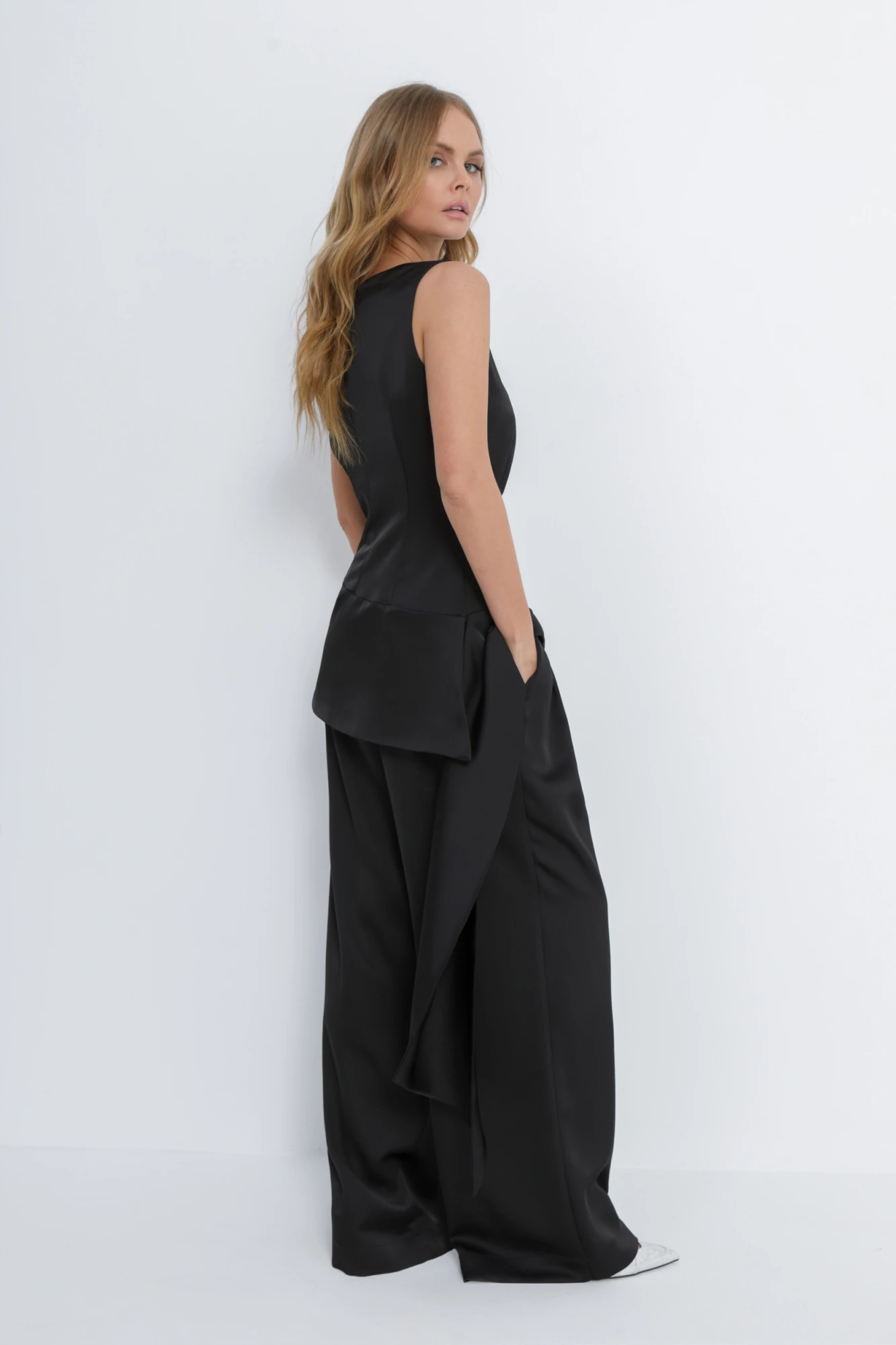 Атласный костюм-двойка из приталенной асимметричной блузы и широких брюк. Детали: туника приталенного силуэта, широкая горловина переда и спинки, талиевые вытачки, фигурный низ, потайная застежка-молния в среднем шве спинки. Брюки с высокой посадкой, передние половины брюк с двумя складками, эластичный пояс-резинка, боковые карманы, без застежки. Длина туники по спинке около 64,5 см. Длина брюк по боковому шву с поясом около 108 см, длина брюк по внутреннему шву около 79,5 см