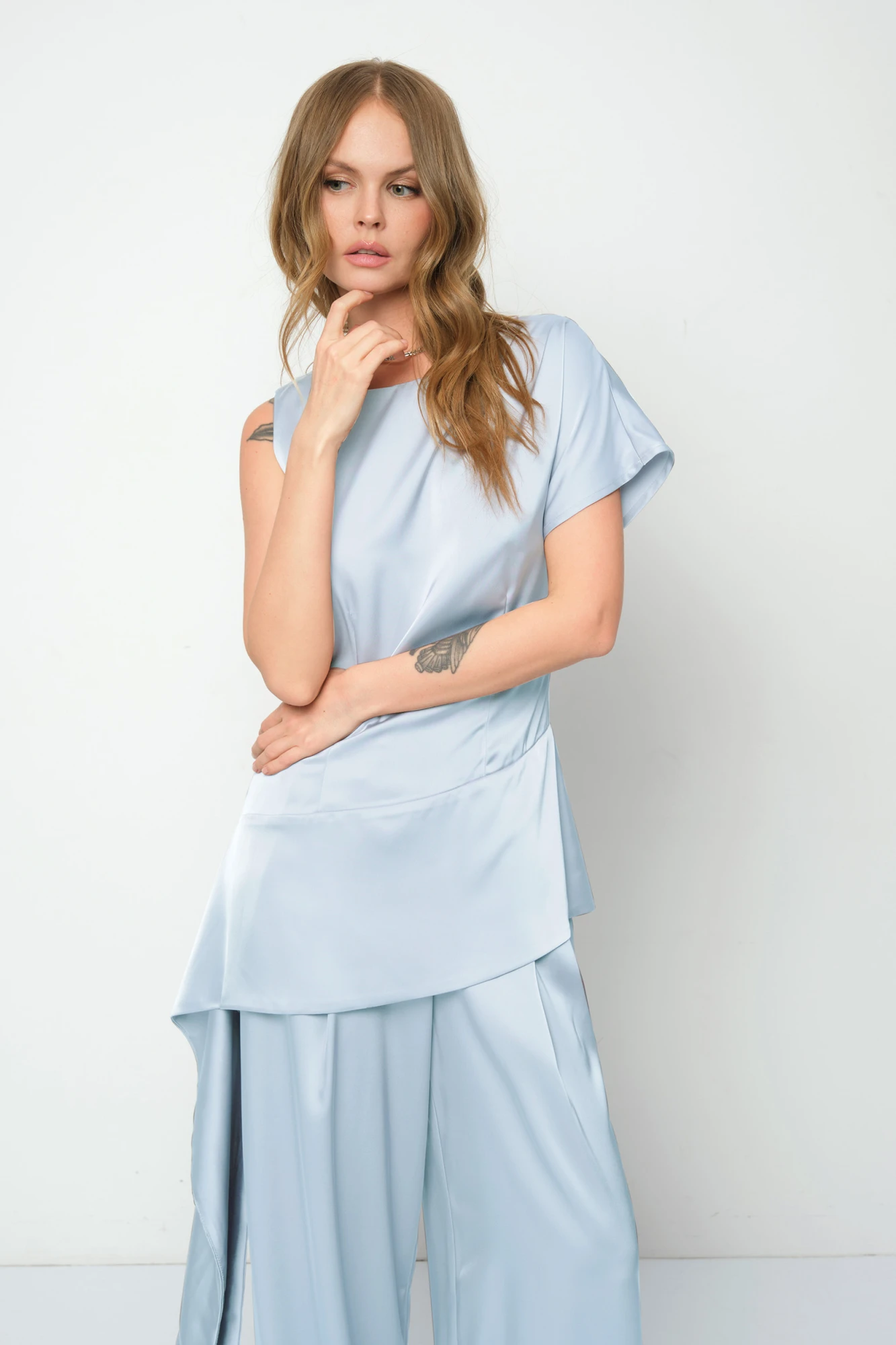 Атласный костюм-двойка из приталенной асимметричной блузы и широких брюк. Детали: туника приталенного силуэта, широкая горловина переда и спинки, талиевые вытачки, фигурный низ, потайная застежка-молния в среднем шве спинки. Брюки с высокой посадкой, передние половины брюк с двумя складками, эластичный пояс-резинка, боковые карманы, без застежки. Длина туники по спинке около 64,5 см. Длина брюк по боковому шву с поясом около 108 см, длина брюк по внутреннему шву около 79,5 см