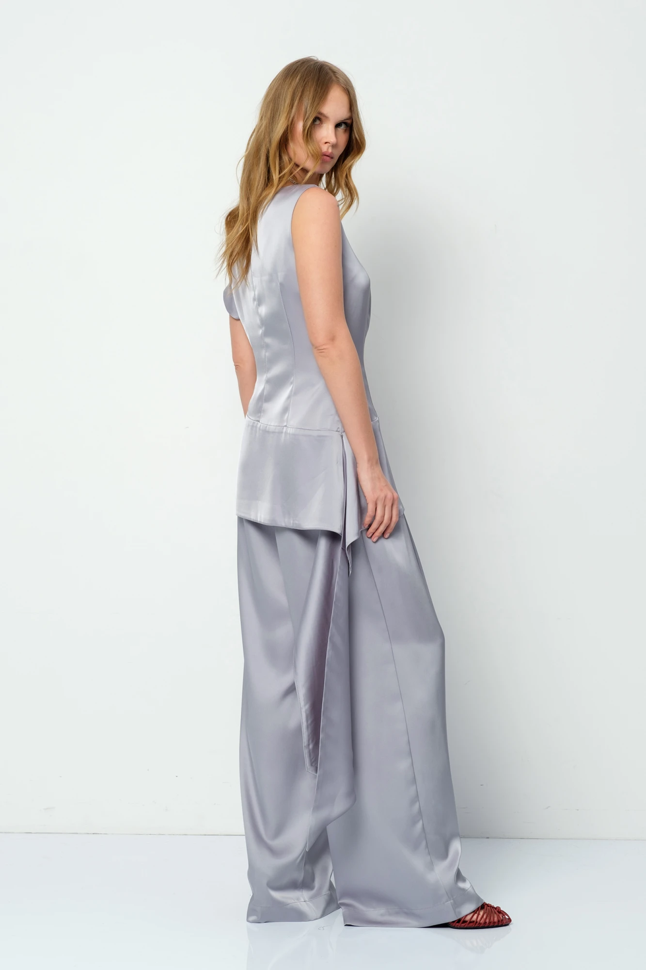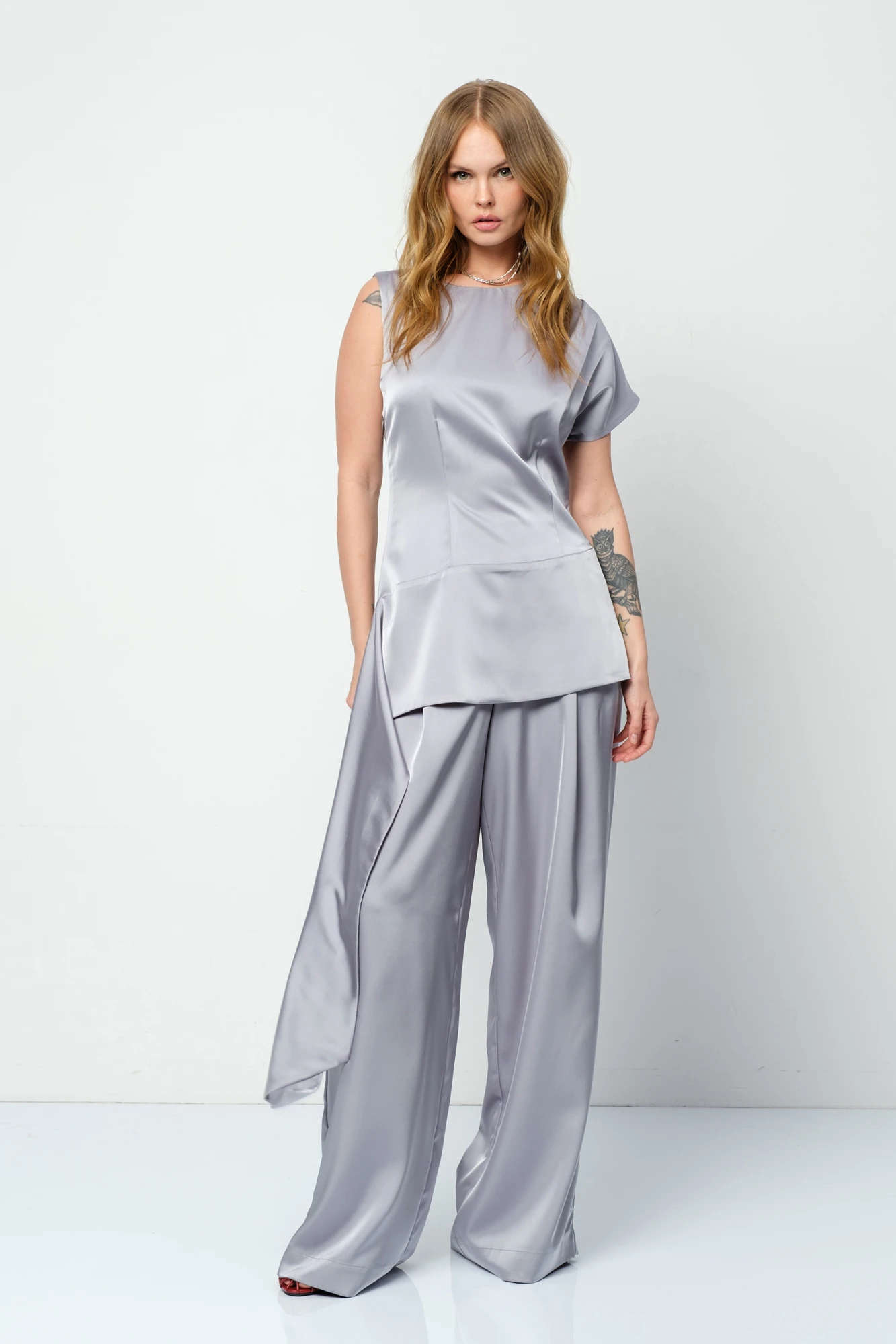 Атласный костюм-двойка из приталенной асимметричной блузы и широких брюк. Детали: туника приталенного силуэта, широкая горловина переда и спинки, талиевые вытачки, фигурный низ, потайная застежка-молния в среднем шве спинки. Брюки с высокой посадкой, передние половины брюк с двумя складками, эластичный пояс-резинка, боковые карманы, без застежки. Длина туники по спинке около 64,5 см. Длина брюк по боковому шву с поясом около 108 см, длина брюк по внутреннему шву около 79,5 см