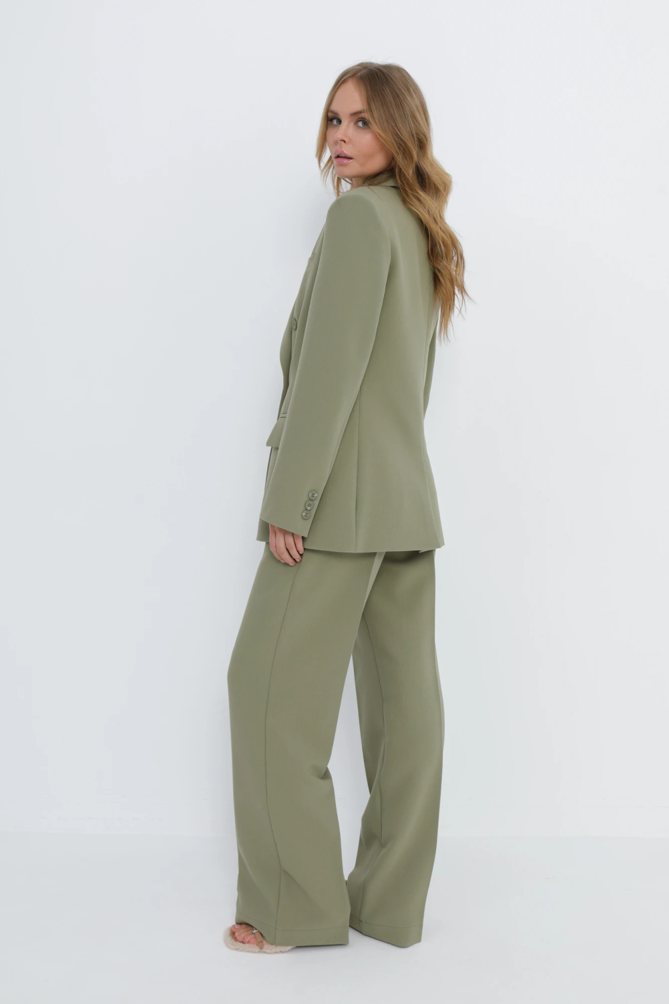 Текстильный костюм-тройка из свободного жакета, полуприлегающего жилета и прямых широких брюк со стрелками. Детали: жакет свободного покроя и полуприлегающего силуэта, двубортная застежка на петли и пуговицы, отрезные бочки, пиджачный воротник, функциональные карманы, жакет на подкладке. Жилет полуприлегающего силуэта, талиевые вытачки, застежка на петли и пуговицы, функциональные карманы, фигурный низ, на подкладке. Брюки с высокой посадкой, притачной пояс со шлевками, передние половины с небольшими застроченными мягкими складками и заутюженными стрелками, застежка на молнию и пуговицу, боковые карманы. Задние части брюк с вытачками и заутюженными стрелками. Пояс брюк прямой, без резинки. Длина жакета по спинке около 69 см в размерах 40-46 и около 72 см в размерах 48-52, длина рукавов около 62 см. Длина жилета по спинке около 48,5 см в размерах 40-46 и около 51,5 см в размерах 48-52. Длина брюк по боковому шву с поясом около 114 в размерах 40-46 и около 115,5 см в размерах 48-52. Длина по внутреннему шву около 83 см