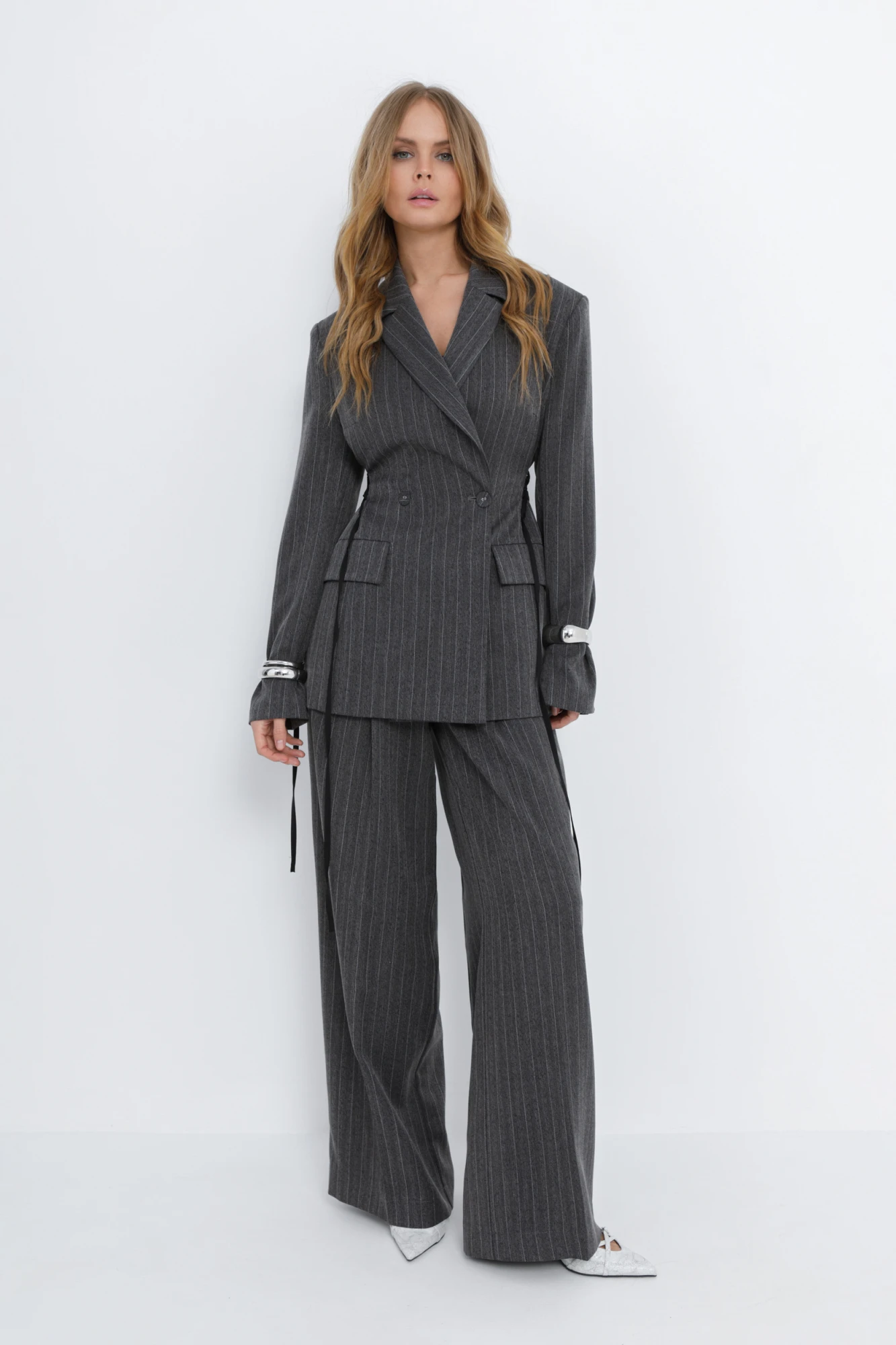 Костюм-двойка из жакета с контрастной шнуровкой и широких брюк-палаццо из текстильной ткани с рисунком «ёлочка». Детали: жакет полуприлегающего силуэта, рельефы, пиджачный воротник, застежка на две петли и пуговицы, функциональные карманы, жакет на подкладке. Жакет также можно зашнуровать по бокам. Брюки с притачным поясом со шлевками, складки у пояса, застежка на молнию и пуговицу, боковые карманы. Задние части брюк с вытачками и имитацией карманов. Длина жакета по спинке около 68,5 в размерах 40-46 и около 71,5 см в размерах 48-52, длина рукавов около 63 см. Длина брюк по боковому шву с поясом около 109,5 см, длина по внутреннему шву около 83 см