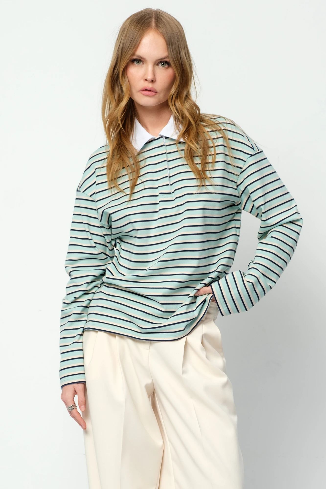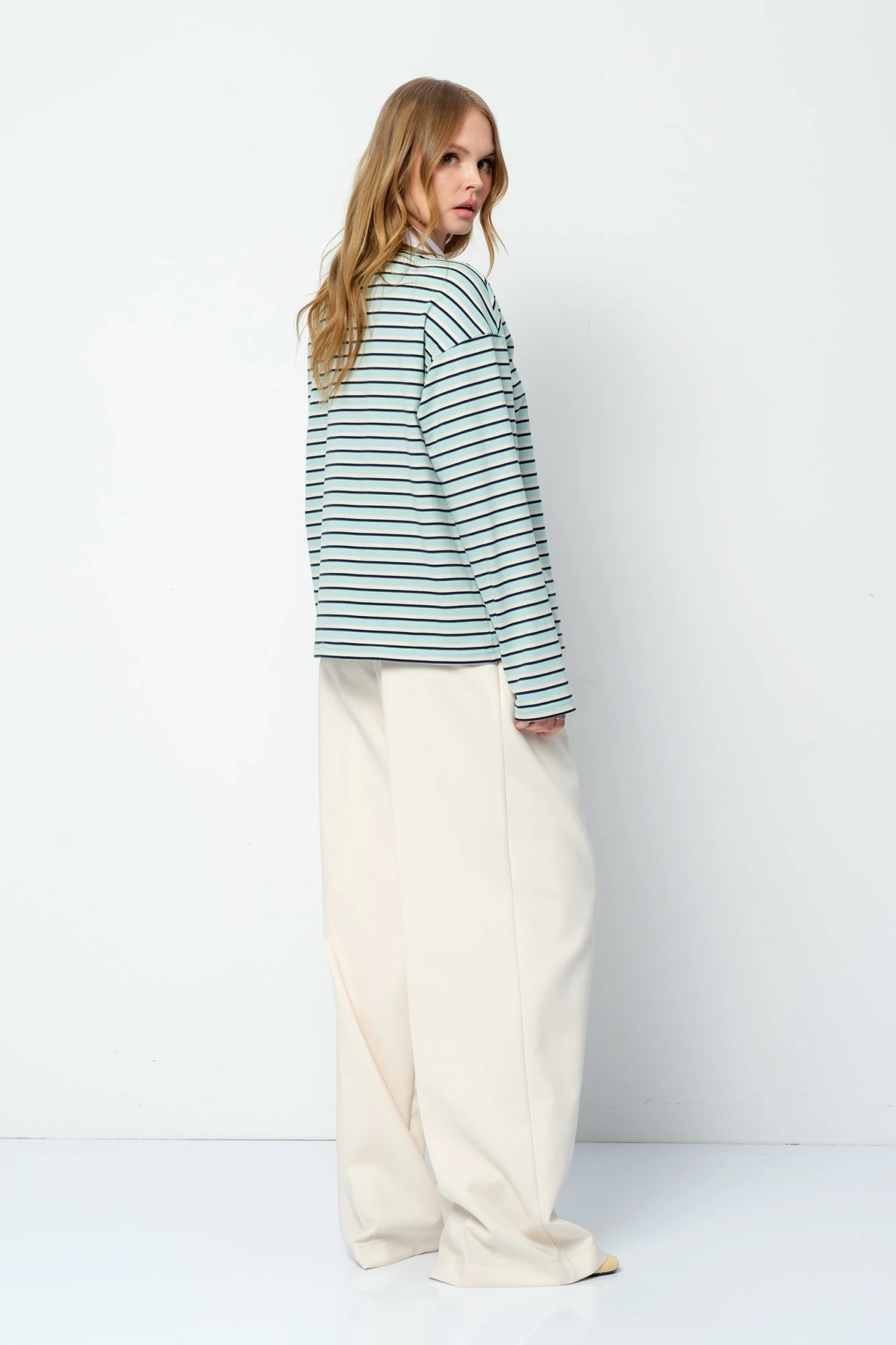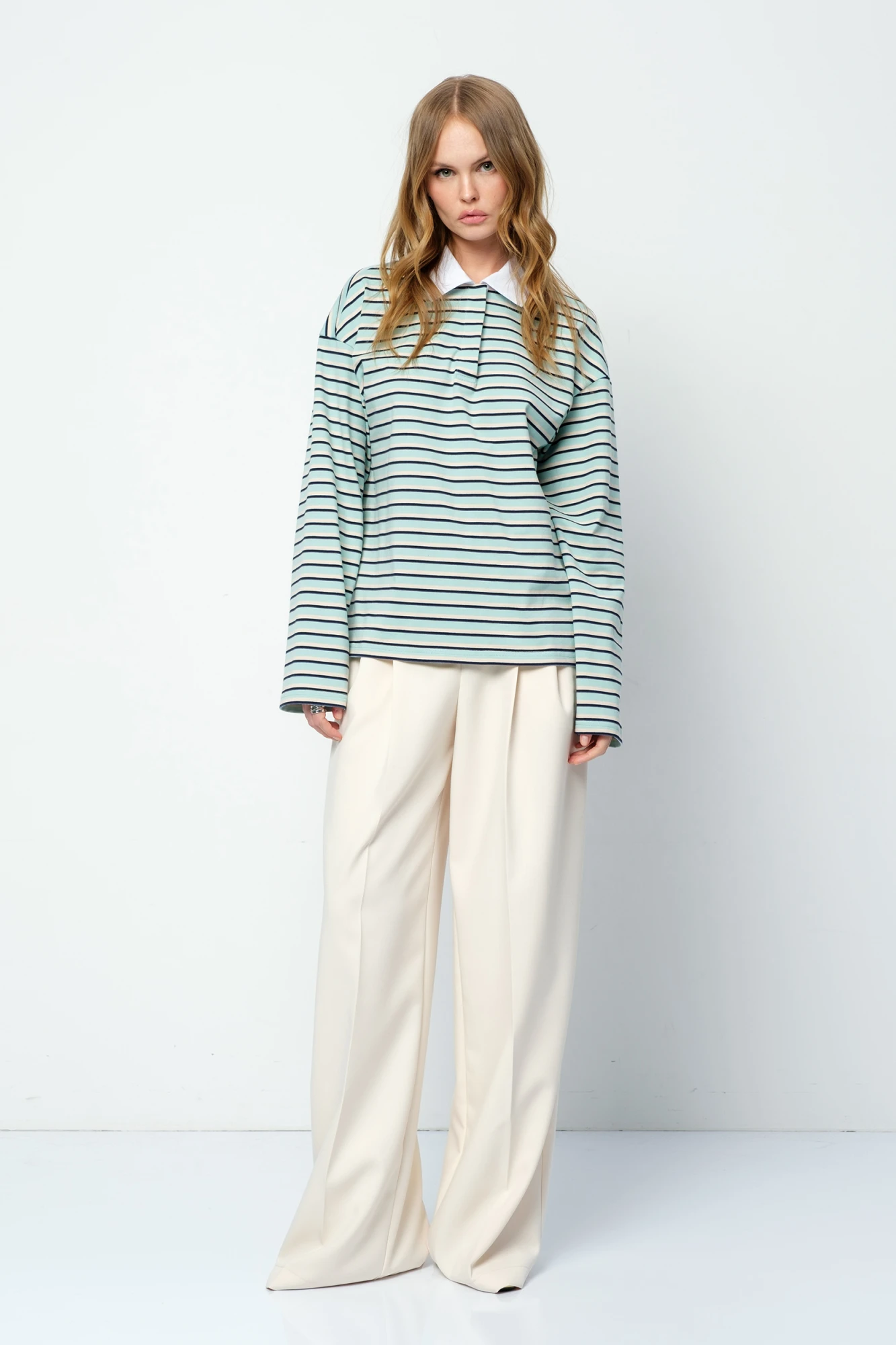 Комплект-двойка из свободного трикотажного поло в полоску и текстильных брюк-палаццо. Детали: поло прямого силуэта, свободный покрой, спущенная линия плеча, потайная застежка на петли и пуговицы, длинные рукава. Широкие брюки-палаццо с небольшими складками у пояса и заутюженными стрелками, притачной пояс со шлевками, застежка на молнию и пуговицу, боковые карманы. Задние части брюк с вытачками и имитацией карманов. Длина поло по спинке около 56 в размерах 40-46 и около 58 см в размерах 48-52, длина рукава+ плечо около 51+9 см. Длина брюк по боковому шву с поясом около 109,5 см, длина по внутреннему шву около 83 см.