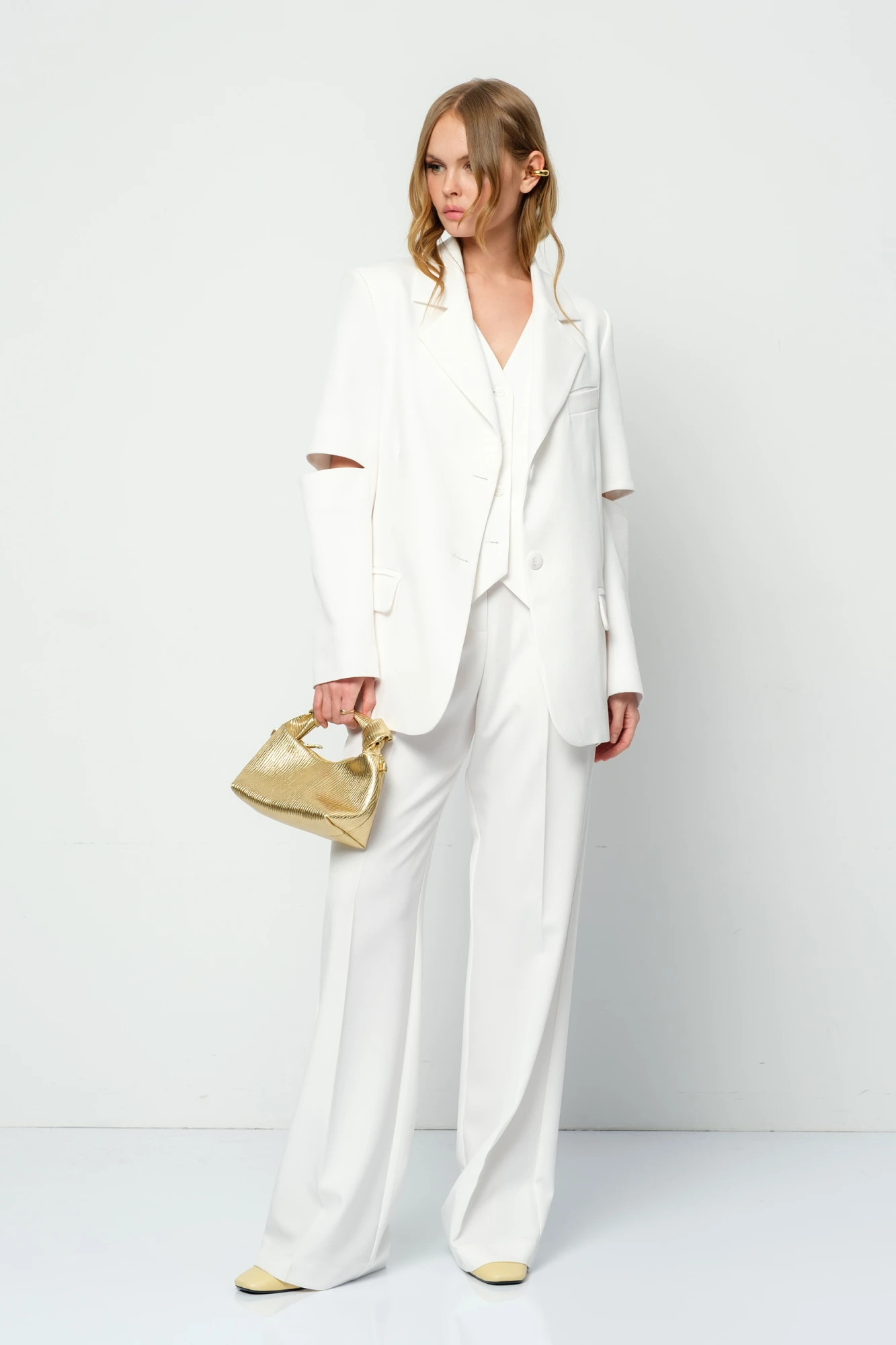 "Текстильный костюм-тройка из оверсайз жакета с разрезами по рукавам, полуприлегающего жилета и прямых широких брюк.
